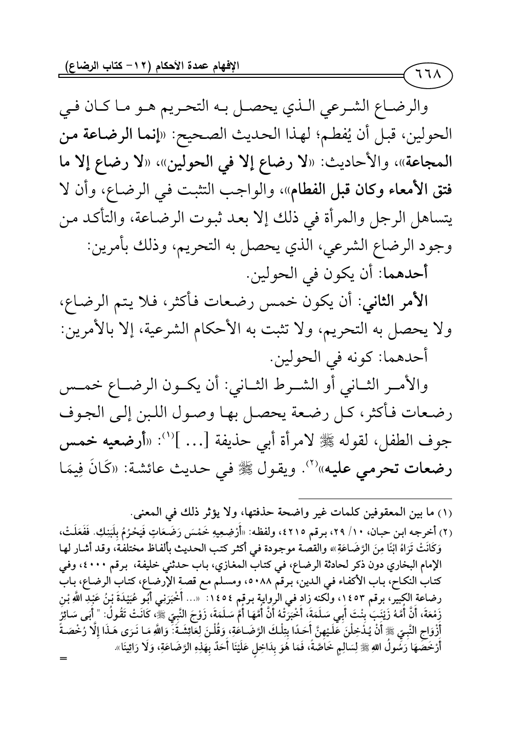 والأمر الثاني أو الشرط الثاني: أن يكون الرضاع خمس رضعات فأكثر، كل رضعة يحصل بها وصول اللبن إلى الجوف جوف الطفل، لقوله - صلى الله عليه وسلم - لامرأة أبي حذيفة [...] (¬1): «أرضعيه خمس رضعات تحرمي عليه» (¬2).