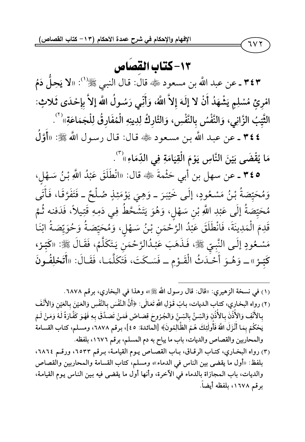 343 - عن عبد اللَّه بن مسعود - رضي الله عنه - قال: قال النبي - صلى الله عليه وسلم - (¬1): «لا يَحِلُّ دَمُ امْرِئٍ مُسْلِمٍ يَشْهَدُ أَنْ لا إلَهَ إِلاَّ اللَّهُ، وَأَنِّي رَسُولُ اللَّه إلاَّ بِإِحْدَى ثَلاثٍ: الثَّيِّبُ الزَّانِي، وَالنَّفْسُ بِالنَّفْسِ، وَالتَّارِكُ لِدِينِهِ الْمُفَارِقُ لِلْجَمَاعَةِ» (¬2).