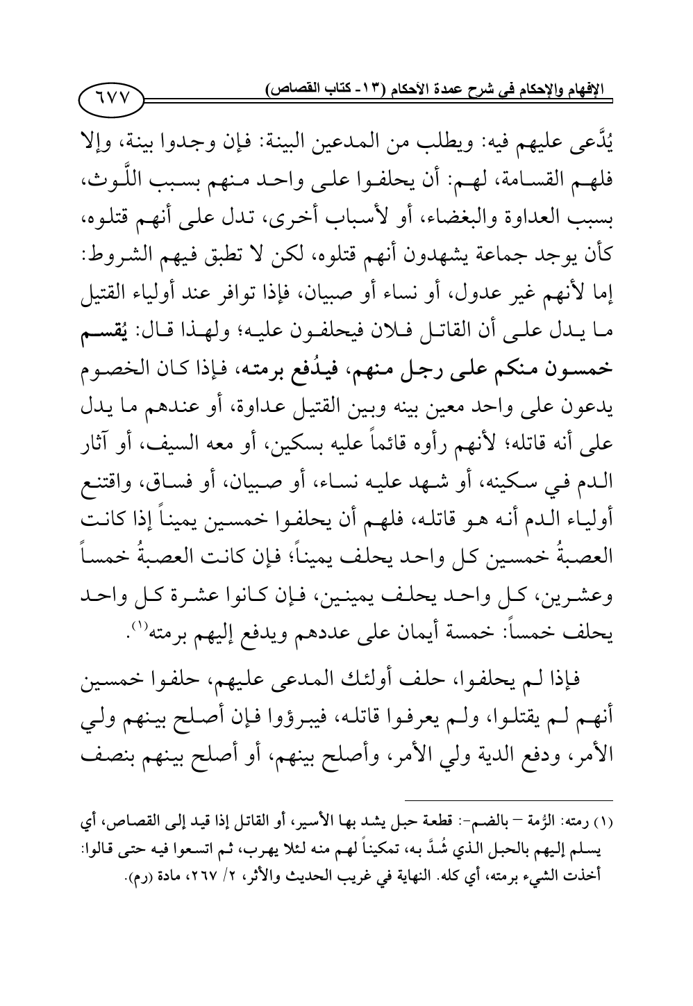 يُدَّعى عليهم فيه: ويطلب من المدعين البينة: فإن وجدوا بينة، وإلا فلهم القسامة، لهم: أن يحلفوا على واحد منهم بسبب اللَّوث، بسبب العداوة والبغضاء، أو لأسباب أخرى، تدل على أنهم قتلوه، كأن يوجد جماعة يشهدون أنهم قتلوه، لكن لا تطبق فيهم الشروط: إما لأنهم غير عدول، أو نساء أو صبيان، فإذا توافر عند أولياء القتيل ما يدل على أن القاتل فلان فيحلفون عليه؛ ولهذا قال: يُقسم خمسون منكم على رجل منهم، فيدُفع برمته، فإذا كان الخصوم يدعون على واحد معين بينه وبين القتيل عداوة، أو عندهم ما يدل على أنه قاتله؛ لأنهم رأوه قائماً عليه بسكين، أو معه السيف، أو آثار الدم في سكينه، أو شهد عليه نساء، أو صبيان، أو فساق، واقتنع أولياء الدم أنه هو قاتله، فلهم أن يحلفوا خمسين يميناً إذا كانت العصبةُ خمسين كل واحد يحلف يميناً؛ فإن كانت العصبةُ خمساً وعشرين، كل واحد يحلف يمينين، فإن كانوا عشرة كل واحد يحلف خمساً: خمسة أيمان على عددهم ويدفع إليهم برمته (¬1).