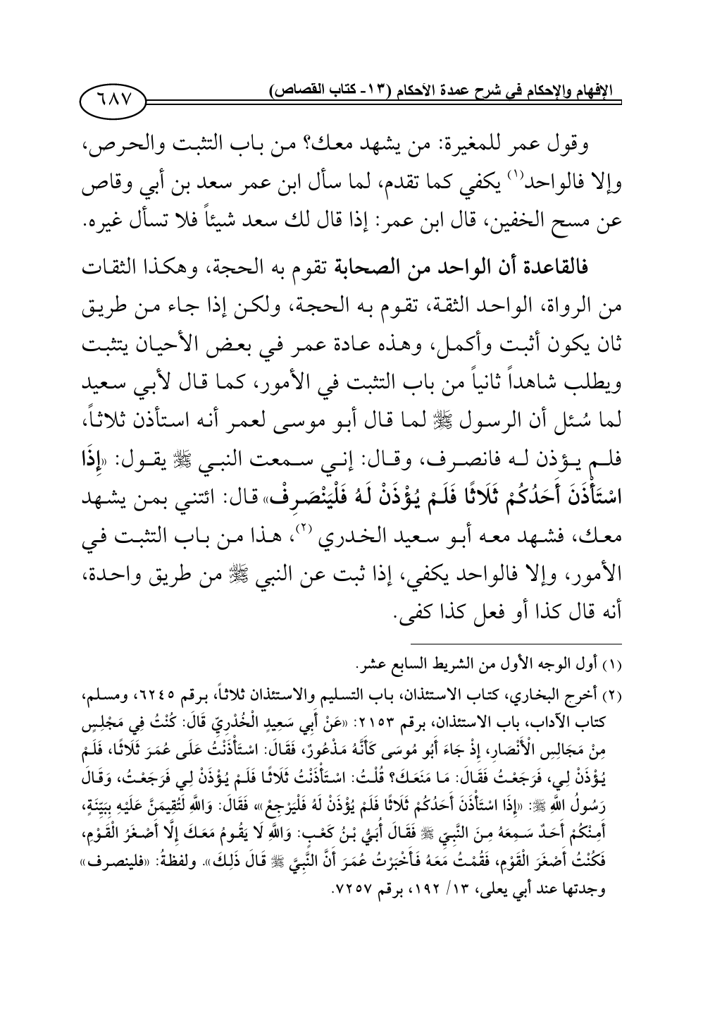 فالقاعدة أن الواحد من الصحابة تقوم به الحجة، وهكذا الثقات من الرواة، الواحد الثقة، تقوم به الحجة، ولكن إذا جاء من طريق ثان يكون أثبت وأكمل، وهذه عادة عمر في بعض الأحيان يتثبت ويطلب شاهداً ثانياً من باب التثبت في الأمور، كما قال لأبي سعيد لما سُئل أن الرسول - صلى الله عليه وسلم - لما قال أبو موسى لعمر أنه استأذن ثلاثاً، فلم يؤذن له فانصرف، وقال: إني سمعت النبي - صلى الله عليه وسلم - يقول: «إِذَا اسْتَاذَنَ أَحَدُكُمْ ثَلَاثًا فَلَمْ يُؤْذَنْ لَهُ فَلْيَنْصَرِفْ» قال: ائتني بمن يشهد معك، فشهد معه أبو سعيد الخدري (¬2)، هذا من باب التثبت في الأمور، وإلا فالواحد يكفي، إذا ثبت عن النبي - صلى الله عليه وسلم - من طريق واحدة، أنه قال كذا أو فعل كذا كفى.