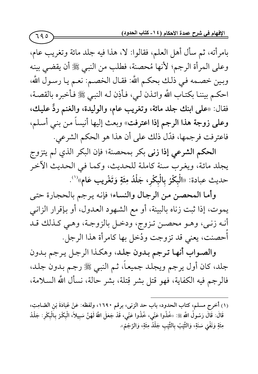 بامرأته، ثم سأل أهل العلم، فقالوا: لا, هذا فيه جلد مائة وتغريب عام, وعلى المرأة الرجم؛ لأنها مُحصنة, فطلب من النبي - صلى الله عليه وسلم - أن يقضي بينه وبين خصمه في ذلك بحكم اللَّه: فقال الخصم: نعم يا رسول اللَّه، احكم بيننا بكتاب اللَّه وائذن لي, فأذِن له النبي - صلى الله عليه وسلم - فأخبره بالقصة، فقال: «على ابنك جلد مائة، وتغريب عام، والوليدة، والغنم ردٌّ عليك، وعلى زوجة هذا الرجم إذا اعترفت» وبعث إليها أنيساً من بني أسلم، فاعترفت فرجمها, فدّل ذلك على أن هذا هو الحكم الشرعي.
