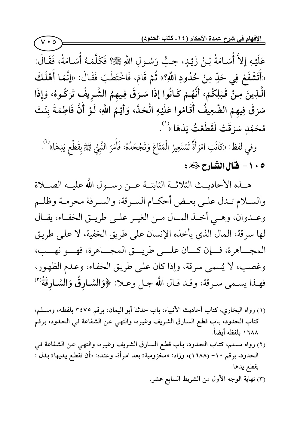(¬1) رواه البخاري، كتاب أحاديث الأنبياء، باب حدثنا أبو اليمان، برقم 3475 بلفظه، ومسلم، كتاب الحدود، باب قطع السارق الشريف وغيره، والنهي عن الشفاعة في الحدود، برقم 1688 بلفظه أيضاً.