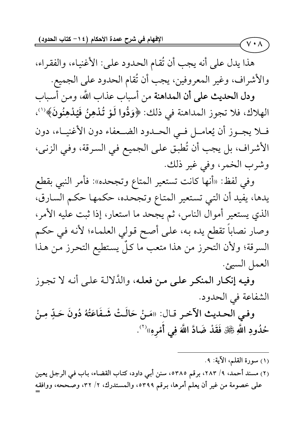 ودل الحديث على أن المداهنة من أسباب عذاب اللَّه، ومن أسباب الهلاك، فلا تجوز المداهنة في ذلك: {وَدُّوا لَوْ تُدْهِنُ فَيُدْهِنُونَ} (¬1)، فلا يجوز أن يُعامل في الحدود الضعفاء دون الأغنياء، دون الأشراف، بل يجب أن تُطبق على الجميع في السرقة، وفي الزنى، وشرب الخمر، وفي غير ذلك.