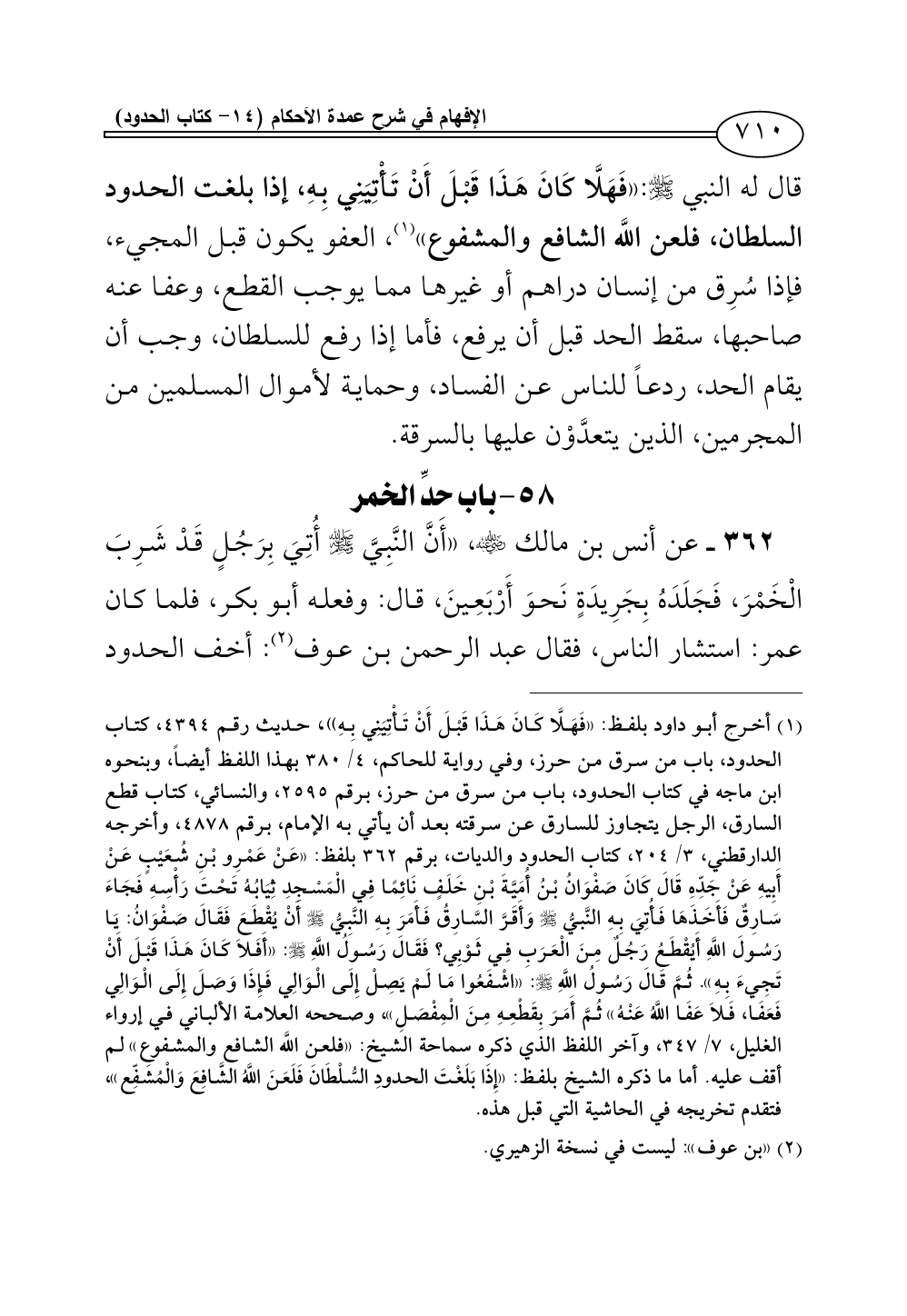 (¬1) أخرج أبو داود بلفظ: «فَهَلَّا كَانَ هَذَا قَبْلَ أَنْ تَاتِيَنِي بِهِ»، حديث رقم 4394، كتاب الحدود، باب من سرق من حرز، وفي رواية للحاكم، 4/ 380 بهذا اللفظ أيضاً، وبنحوه ابن ماجه في كتاب الحدود، باب من سرق من حرز، برقم 2595، والنسائي، كتاب قطع السارق، الرجل يتجاوز للسارق عن سرقته بعد أن يأتي به الإمام، برقم 4878، وأخرجه الدارقطني، 3/ 204، كتاب الحدود والديات، برقم 362 بلفظ: «عَنْ عَمْرِو بْنِ شُعَيْبٍ عَنْ أَبِيهِ عَنْ جَدِّهِ قَالَ كَانَ صَفْوَانُ بْنُ أُمَيَّةَ بْنِ خَلَفٍ نَائِمًا فِي الْمَسْجِدِ ثِيَابُهُ تَحْتَ رَاسِهِ فَجَاءَ سَارِقٌ فَأَخَذَهَا فَأُتِيَ بِهِ النَّبيُّ - صلى الله عليه وسلم - وَأَقَرَّ السَّارِقُ فَأَمَرَ بِهِ النَّبِيُّ - صلى الله عليه وسلم - أَنْ يُقْطَعَ فَقَالَ صَفْوَانُ: يَا رَسُولَ اللَّهِ أَيُقْطَعُ رَجُلٌ مِنَ الْعَرَبِ فِي ثَوْبِي؟ فَقَالَ رَسُولُ اللَّهِ - صلى الله عليه وسلم -: «أَفَلاَ كَانَ هَذَا قَبْلَ أَنْ تَجِيءَ بِهِ» .. ثُمَّ قَالَ رَسُولُ اللَّهِ - صلى الله عليه وسلم -: «اشْفَعُوا مَا لَمْ يَصِلْ إِلَى الْوَالِي فَإِذَا وَصَلَ إِلَى الْوَالِي فَعَفَا، فَلاَ عَفَا اللَّهُ عَنْهُ» ثُمَّ أَمَرَ بِقَطْعِهِ مِنَ الْمِفْصَلِ»، وصححه العلامة الألباني في إرواء الغليل، 7/ 347، وآخر اللفظ الذي ذكره سماحة الشيخ: «فلعن اللَّه الشافع والمشفوع» لم أقف عليه. أما ما ذكره الشيخ بلفظ: «إِذَا بَلَغْتَ الحدودِ السُّلْطَانَ فَلَعَنَ اللَّهُ الشَّافِعَ وَالْمُشَفِّع»، فتقدم تخريجه في الحاشية التي قبل هذه.