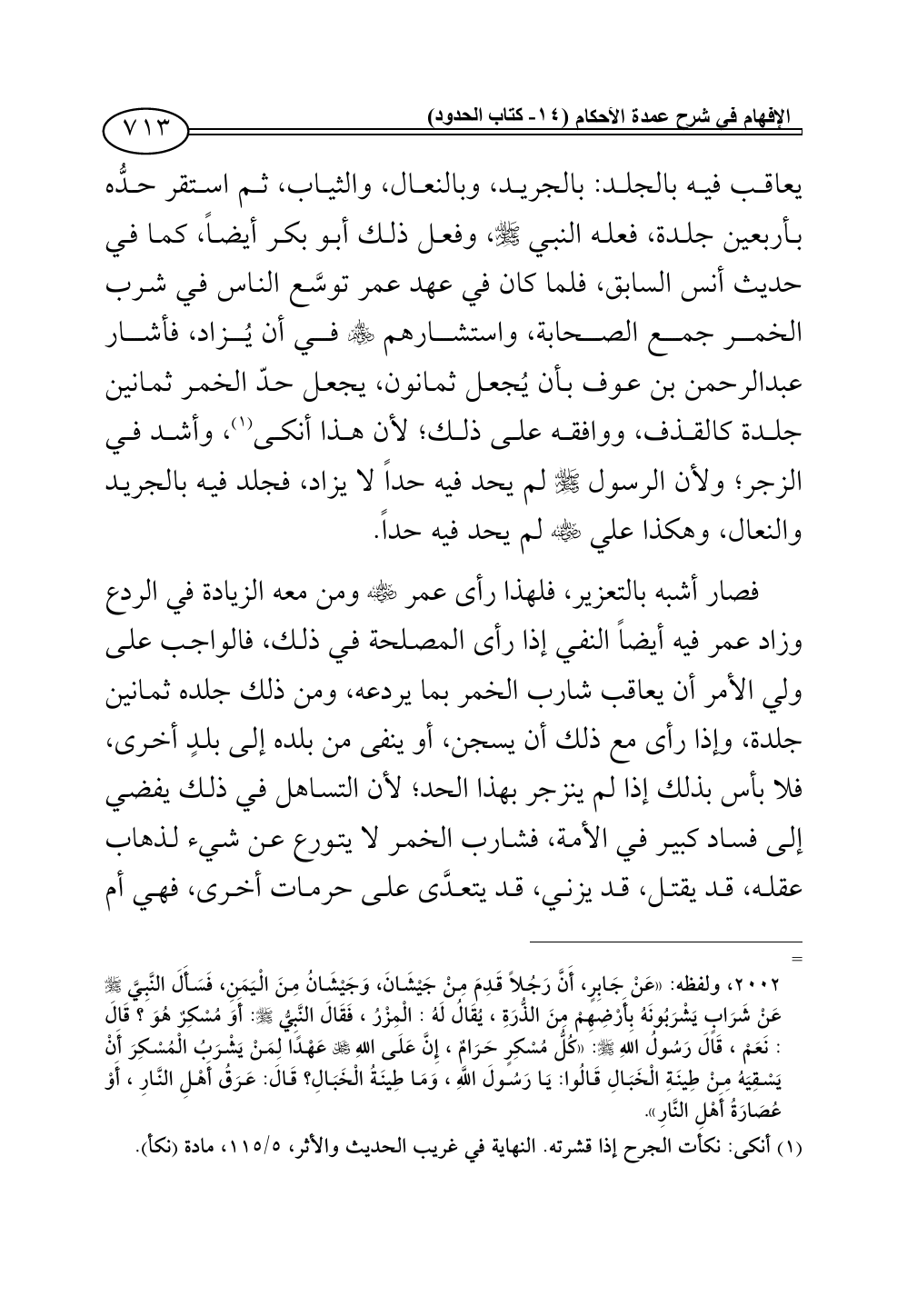 فصار أشبه بالتعزير، فلهذا رأى عمر - رضي الله عنه - ومن معه الزيادة في الردع وزاد عمر فيه أيضاً النفي إذا رأى المصلحة في ذلك، فالواجب على ولي الأمر أن يعاقب شارب الخمر بما يردعه، ومن ذلك جلده ثمانين جلدة، وإذا رأى مع ذلك أن يسجن، أو ينفى من بلده إلى بلدٍ أخرى، فلا بأس بذلك إذا لم ينزجر بهذا الحد؛ لأن التساهل في ذلك يفضي إلى فساد كبير في الأمة، فشارب الخمر لا يتورع عن شيء لذهاب عقله، قد يقتل، قد يزني، قد يتعدَّى على حرمات أخرى، فهي أم