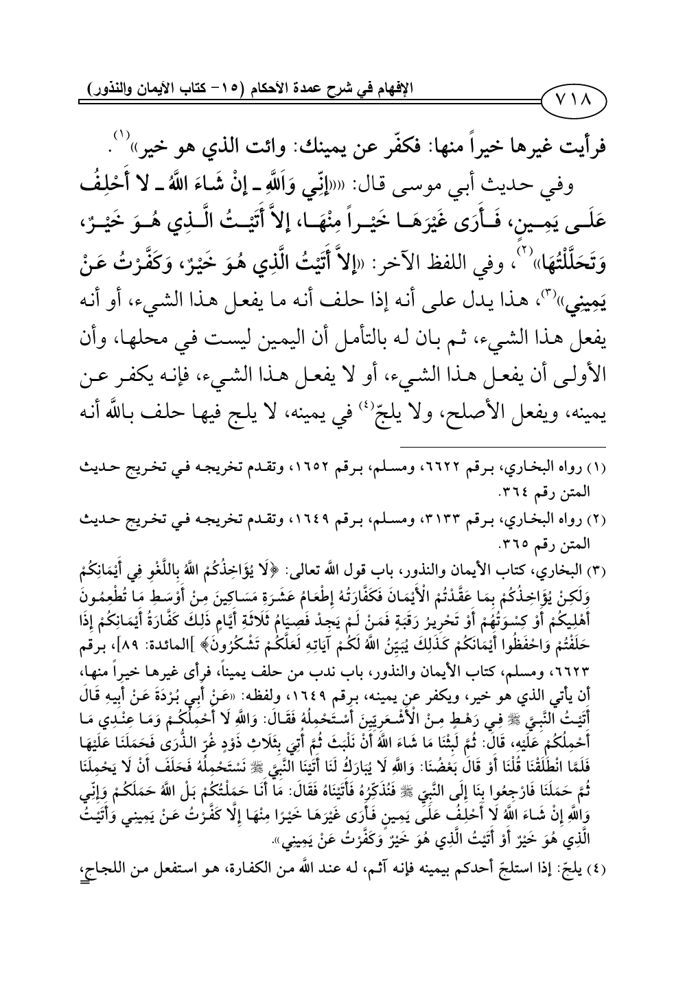 (¬3) البخاري، كتاب الأيمان والنذور، باب قول اللَّه تعالى: {لَا يُؤَاخِذُكُمْ اللَّهُ بِاللَّغْوِ فِي أَيْمَانِكُمْ وَلَكِنْ يُؤَاخِذُكُمْ بِمَا عَقَّدْتُمْ الْأَيْمَانَ فَكَفَّارَتُهُ إِطْعَامُ عَشَرَةِ مَسَاكِينَ مِنْ أَوْسَطِ مَا تُطْعِمُونَ أَهْلِيكُمْ أَوْ كِسْوَتُهُمْ أَوْ تَحْرِيرُ رَقَبَةٍ فَمَنْ لَمْ يَجِدْ فَصِيَامُ ثَلَاثَةِ أَيَّامٍ ذَلِكَ كَفَّارَةُ أَيْمَانِكُمْ إِذَا حَلَفْتُمْ وَاحْفَظُوا أَيْمَانَكُمْ كَذَلِكَ يُبَيِّنُ اللَّهُ لَكُمْ آيَاتِهِ لَعَلَّكُمْ تَشْكُرُونَ}] المائدة: 89]، برقم 6623، ومسلم، كتاب الأيمان والنذور، باب ندب من حلف يميناً، فرأى غيرها خيراً منها، أن يأتي الذي هو خير، ويكفر عن يمينه، برقم 1649، ولفظه: «عَنْ أَبِي بُرْدَةَ عَنْ أَبِيهِ قَالَ أَتَيْتُ النَّبِيَّ - صلى الله عليه وسلم - فِي رَهْطٍ مِنْ الْأَشْعَرِيِّينَ أَسْتَحْمِلُهُ فَقَالَ: وَاللَّهِ لَا أَحْمِلُكُمْ وَمَا عِنْدِي مَا أَحْمِلُكُمْ عَلَيْهِ، قَالَ: ثُمَّ لَبِثْنَا مَا شَاءَ اللَّهُ أَنْ نَلْبَثَ ثُمَّ أُتِيَ بِثَلَاثِ ذَوْدٍ غُرِّ الذُّرَى فَحَمَلَنَا عَلَيْهَا فَلَمَّا انْطَلَقْنَا قُلْنَا أَوْ قَالَ بَعْضُنَا: وَاللَّهِ لَا يُبَارَكُ لَنَا أَتَيْنَا النَّبِيَّ - صلى الله عليه وسلم - نَسْتَحْمِلُهُ فَحَلَفَ أَنْ لَا يَحْمِلَنَا ثُمَّ حَمَلَنَا فَارْجِعُوا بِنَا إِلَى النَّبِيِّ - صلى الله عليه وسلم - فَنُذَكِّرُهُ فَأَتَيْنَاهُ فَقَالَ: مَا أَنَا حَمَلْتُكُمْ بَلْ اللَّهُ حَمَلَكُمْ وَإِنِّي وَاللَّهِ إِنْ شَاءَ اللَّهُ لَا أَحْلِفُ عَلَى يَمِينٍ فَأَرَى غَيْرَهَا خَيْرًا مِنْهَا إِلَّا كَفَّرْتُ عَنْ يَمِينِي وَأَتَيْتُ الَّذِي هُوَ خَيْرٌ أَوْ أَتَيْتُ الَّذِي هُوَ خَيْرٌ وَكَفَّرْتُ عَنْ يَمِينِي».