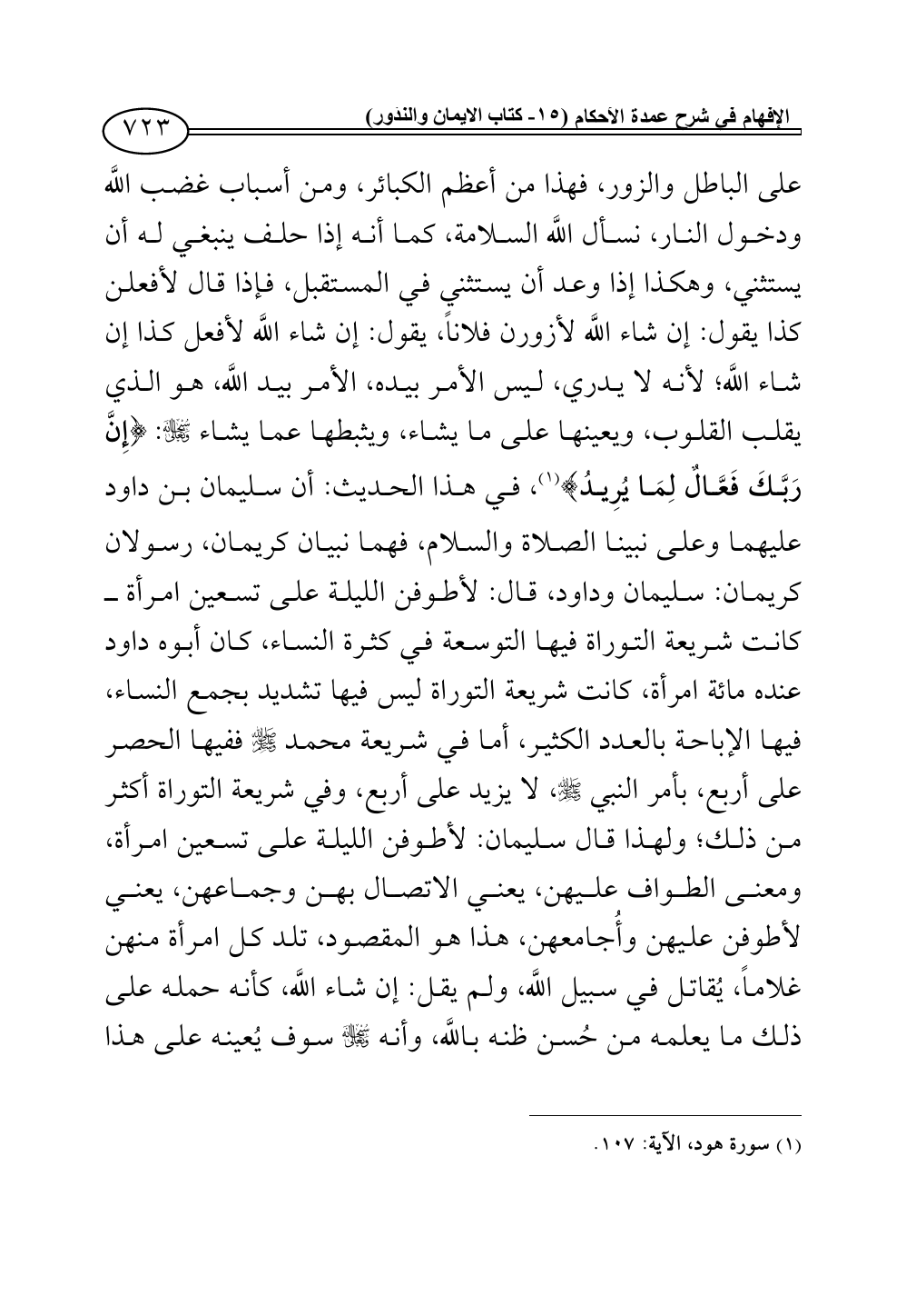 في هذا الحديث: أن سليمان بن داود عليهما وعلى نبينا الصلاة والسلام، فهما نبيان كريمان، رسولان كريمان: سليمان وداود، قال: لأطوفن الليلة على تسعين امرأة ــ كانت شريعة التوراة فيها التوسعة في كثرة النساء، كان أبوه داود عنده مائة امرأة، كانت شريعة التوراة ليس فيها تشديد بجمع النساء، فيها الإباحة بالعدد الكثير، أما في شريعة محمد - صلى الله عليه وسلم - ففيها الحصر على أربع، بأمر النبي - صلى الله عليه وسلم -، لا يزيد على أربع، وفي شريعة التوراة أكثر من ذلك؛ ولهذا قال سليمان: لأطوفن الليلة على تسعين امرأة، ومعنى الطواف عليهن، يعني الاتصال بهن وجماعهن، يعني لأطوفن عليهن وأُجامعهن، هذا هو المقصود، تلد كل امرأة منهن غلاماً، يُقاتل في سبيل اللَّه، ولم يقل: إن شاء اللَّه، كأنه حمله على ذلك ما يعلمه من حُسن ظنه باللَّه، وأنه - سبحانه وتعالى - سوف يُعينه على هذا
