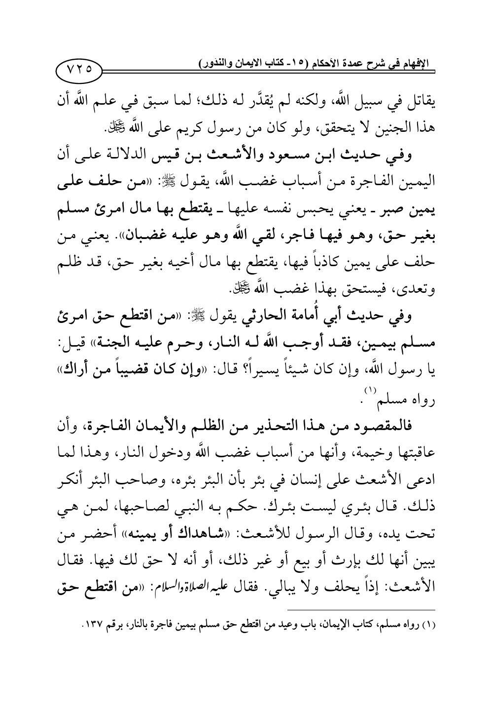 (¬1) رواه مسلم، كتاب الإيمان، باب وعيد من اقتطع حق مسلم بيمين فاجرة بالنار، برقم 137.
