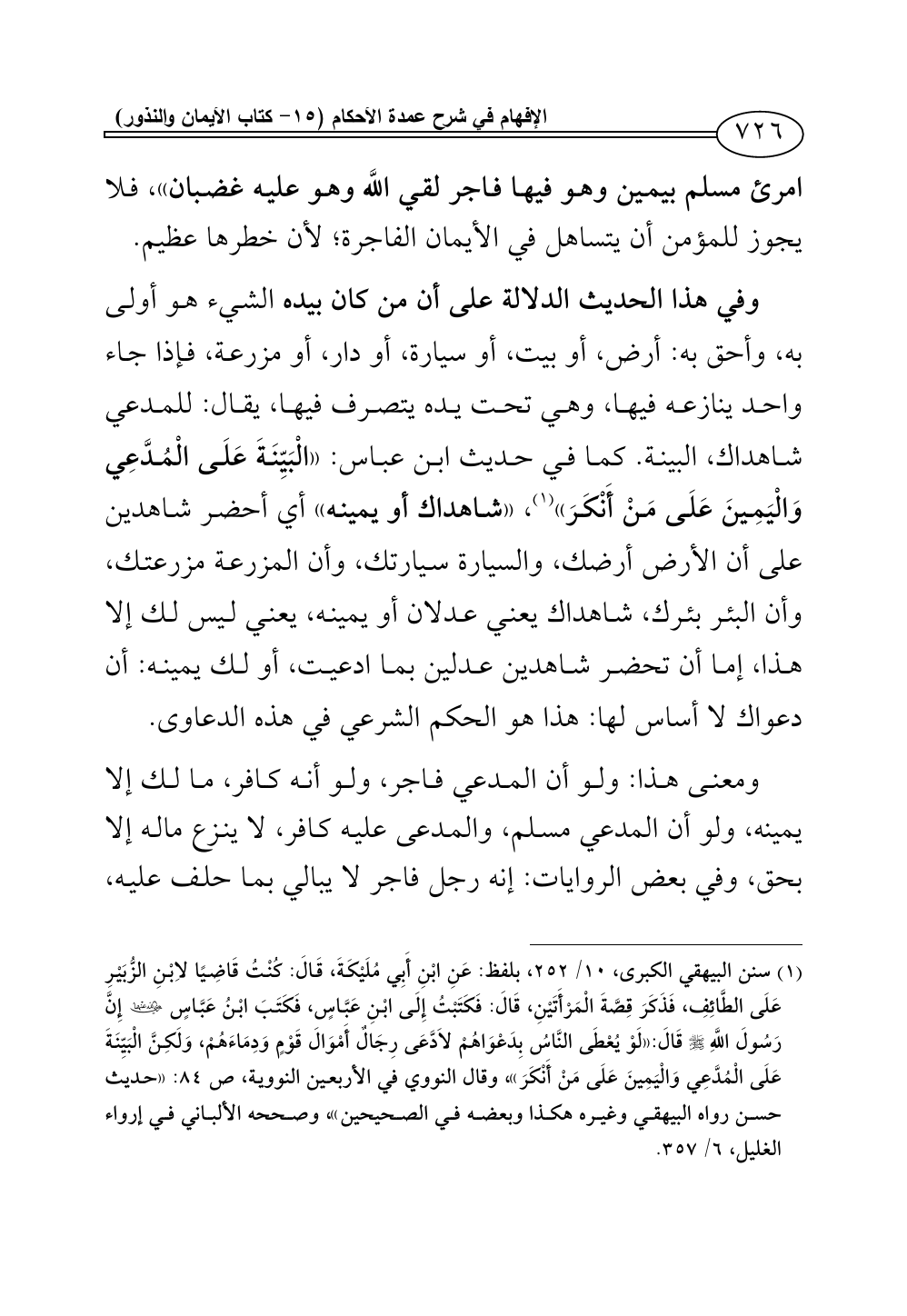(¬1) سنن البيهقي الكبرى، 10/ 252، بلفظ: عَنِ ابْنِ أَبِي مُلَيْكَةَ، قَالَ: كُنْتُ قَاضِيًا لاِبْنِ الزُّبَيْرِ عَلَى الطَّائِفِ، فَذَكَرَ قِصَّةَ الْمَرْأَتَيْنِ، قَالَ: فَكَتَبْتُ إِلَى ابْنِ عَبَّاسٍ، فَكَتَبَ ابْنُ عَبَّاسٍ - رضي الله عنهما - إِنَّ رَسُولَ اللَّهِ - صلى الله عليه وسلم - قَالَ: «لَوْ يُعْطَى النَّاسُ بِدَعْوَاهُمْ لاَدَّعَى رِجَالٌ أَمْوَالَ قَوْمٍ وَدِمَاءَهُمْ، وَلَكِنَّ الْبَيِّنَةَ عَلَى الْمُدَّعِي وَالْيَمِينَ عَلَى مَنْ أَنْكَرَ»، وقال النووي في الأربعين النووية، ص 84: «حديث حسن رواه البيهقي وغيره هكذا وبعضه في الصحيحين»، وصححه الألباني في إرواء الغليل، 6/ 357.