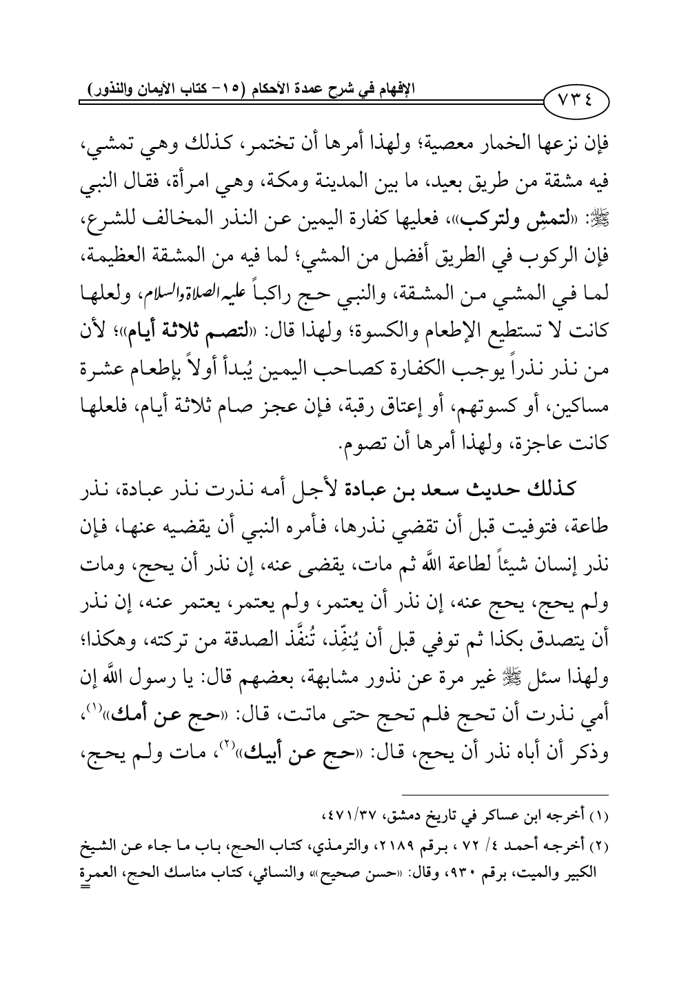 كذلك حديث سعد بن عبادة لأجل أمه نذرت نذر عبادة، نذر طاعة، فتوفيت قبل أن تقضي نذرها، فأمره النبي أن يقضيه عنها, فإن نذر إنسان شيئاً لطاعة اللَّه ثم مات، يقضى عنه، إن نذر أن يحج، ومات ولم يحج، يحج عنه, إن نذر أن يعتمر، ولم يعتمر, يعتمر عنه, إن نذر أن يتصدق بكذا ثم توفي قبل أن يُنفِّذ, تُنفَّذ الصدقة من تركته, وهكذا؛ ولهذا سئل - صلى الله عليه وسلم - غير مرة عن نذور مشابهة، بعضهم قال: يا رسول اللَّه إن أمي نذرت أن تحج فلم تحج حتى ماتت، قال: «حج عن أمك» (¬1) , وذكر أن أباه نذر أن يحج، قال: «حج عن أبيك» (¬2)، مات ولم يحج,