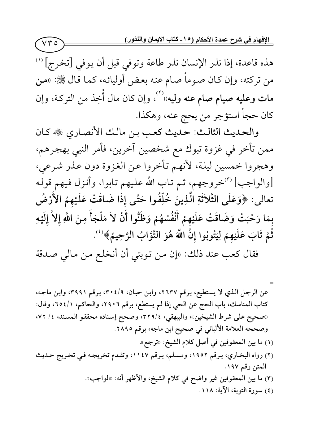 والحديث الثالث: حديث كعب بن مالك الأنصاري - رضي الله عنه - كان ممن تأخر في غزوة تبوك مع شخصين آخرين، فأمر النبي بهجرهم، وهجروا خمسين ليلة، لأنهم تأخروا عن الغزوة دون عذر شرعي, [والواجب] (¬3) خروجهم، ثم تاب اللَّه عليهم تابوا، وأنزل فيهم قوله تعالى: {وَعَلَى الثَّلاَثَةِ الَّذِينَ خُلِّفُوا حَتَّى إِذَا ضَاقَتْ عَلَيْهِمُ الأَرْضُ بِمَا رَحُبَتْ وَضَاقَتْ عَلَيْهِمْ أَنْفُسُهُمْ وَظَنُّوا أَنْ لاَ مَلْجَأَ مِنَ اللَّهِ إِلاَّ إِلَيْهِ ثُمَّ تَابَ عَلَيْهِمْ لِيَتُوبُوا إِنَّ اللَّهَ هُوَ التَّوَّابُ الرَّحِيمُ} (¬4).