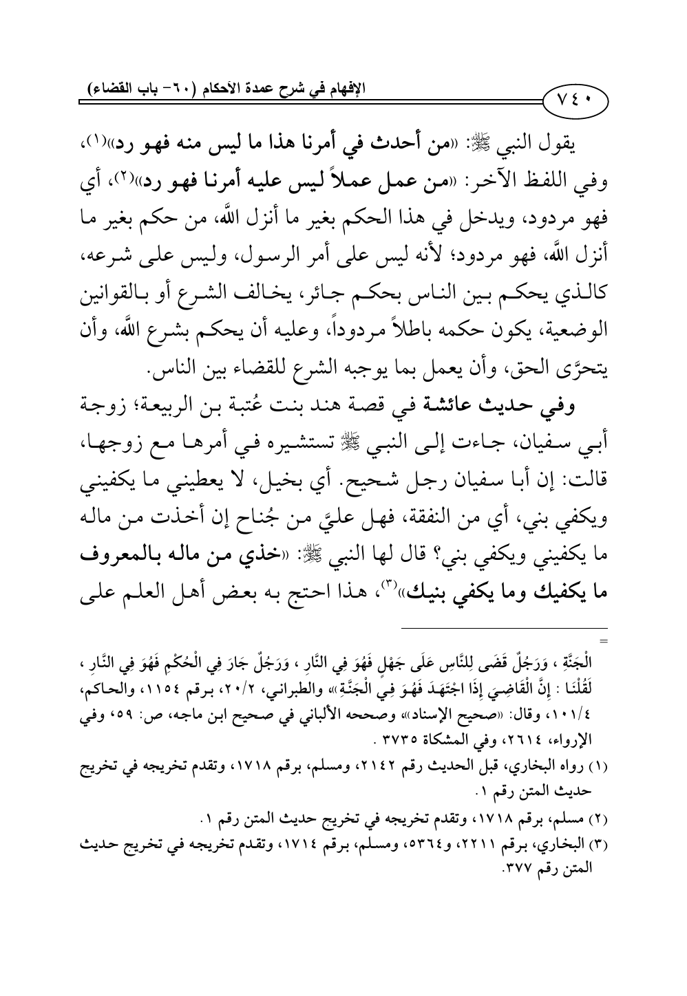 يقول النبي - صلى الله عليه وسلم -: «من أحدث في أمرنا هذا ما ليس منه فهو رد» (¬1)، وفي اللفظ الآخر: «من عمل عملاً ليس عليه أمرنا فهو رد» (¬2)، أي فهو مردود، ويدخل في هذا الحكم بغير ما أنزل اللَّه، من حكم بغير ما أنزل اللَّه، فهو مردود؛ لأنه ليس على أمر الرسول، وليس على شرعه، كالذي يحكم بين الناس بحكم جائر، يخالف الشرع أو بالقوانين الوضعية، يكون حكمه باطلاً مردوداً، وعليه أن يحكم بشرع اللَّه، وأن يتحرَّى الحق، وأن يعمل بما يوجبه الشرع للقضاء بين الناس.