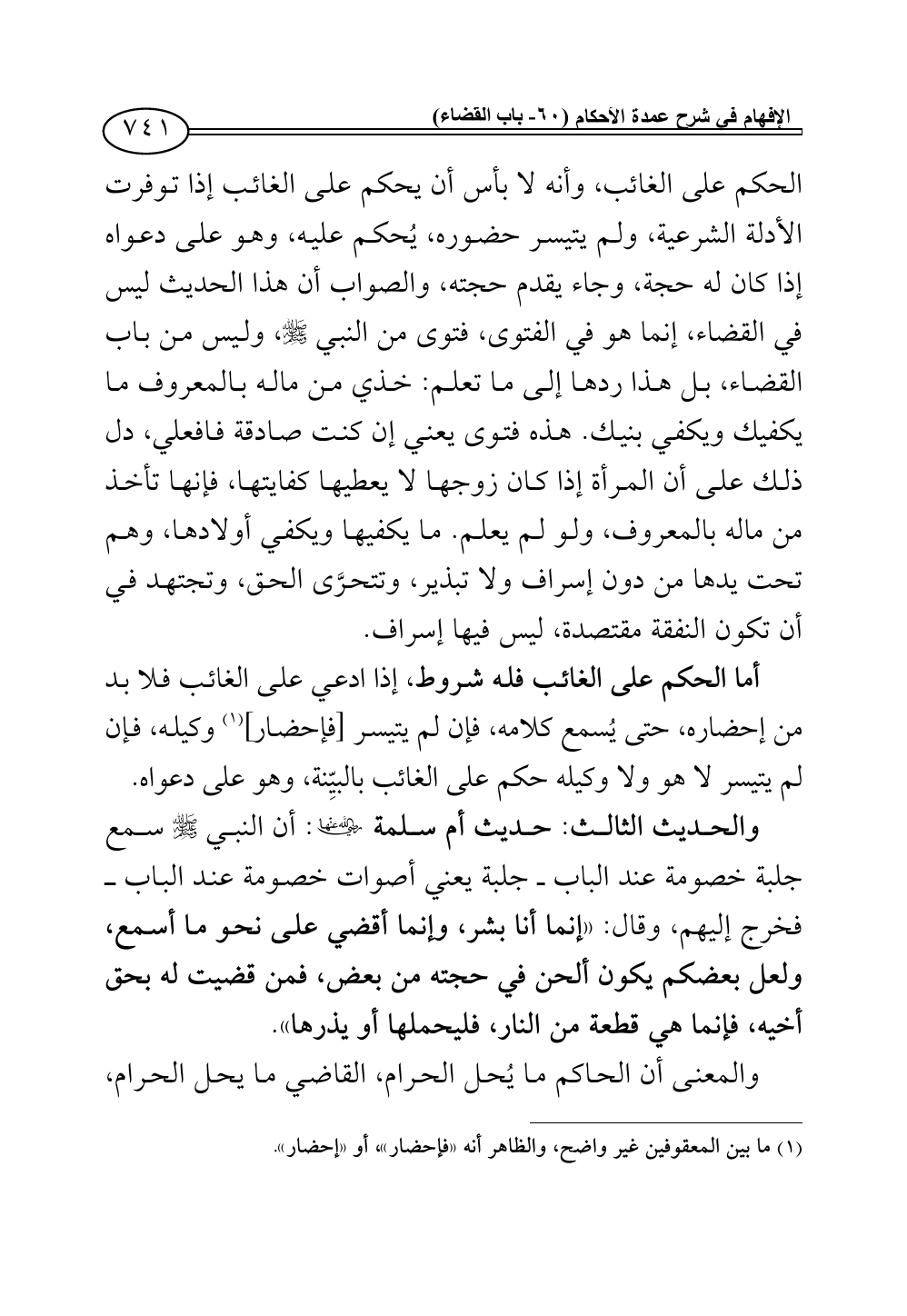 الحكم على الغائب, وأنه لا بأس أن يحكم على الغائب إذا توفرت الأدلة الشرعية، ولم يتيسر حضوره، يُحكم عليه، وهو على دعواه إذا كان له حجة، وجاء يقدم حجته، والصواب أن هذا الحديث ليس في القضاء، إنما هو في الفتوى، فتوى من النبي - صلى الله عليه وسلم -، وليس من باب القضاء، بل هذا ردها إلى ما تعلم: خذي من ماله بالمعروف ما يكفيك ويكفي بنيك. هذه فتوى يعني إن كنت صادقة فافعلي, دل ذلك على أن المرأة إذا كان زوجها لا يعطيها كفايتها، فإنها تأخذ من ماله بالمعروف، ولو لم يعلم. ما يكفيها ويكفي أولادها، وهم تحت يدها من دون إسراف ولا تبذير، وتتحرَّى الحق، وتجتهد في أن تكون النفقة مقتصدة، ليس فيها إسراف.