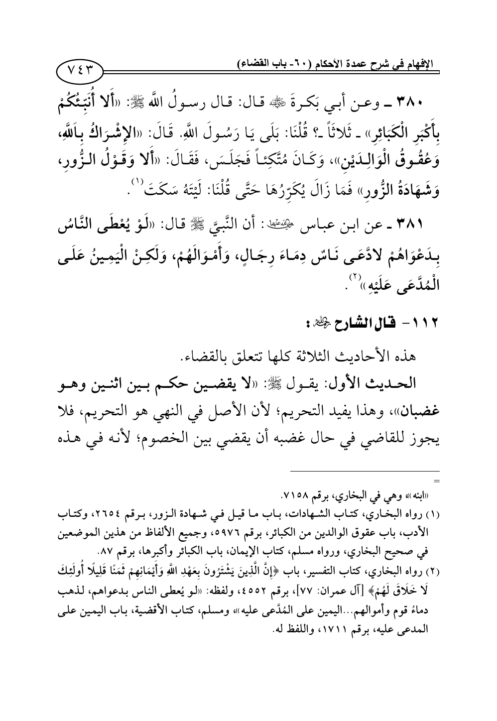 (¬1) رواه البخاري، كتاب الشهادات، باب ما قيل في شهادة الزور، برقم 2654، وكتاب الأدب، باب عقوق الوالدين من الكبائر، برقم 5976، وجميع الألفاظ من هذين الموضعين في صحيح البخاري، ورواه مسلم، كتاب الإيمان، باب الكبائر وأكبرها، برقم 87.