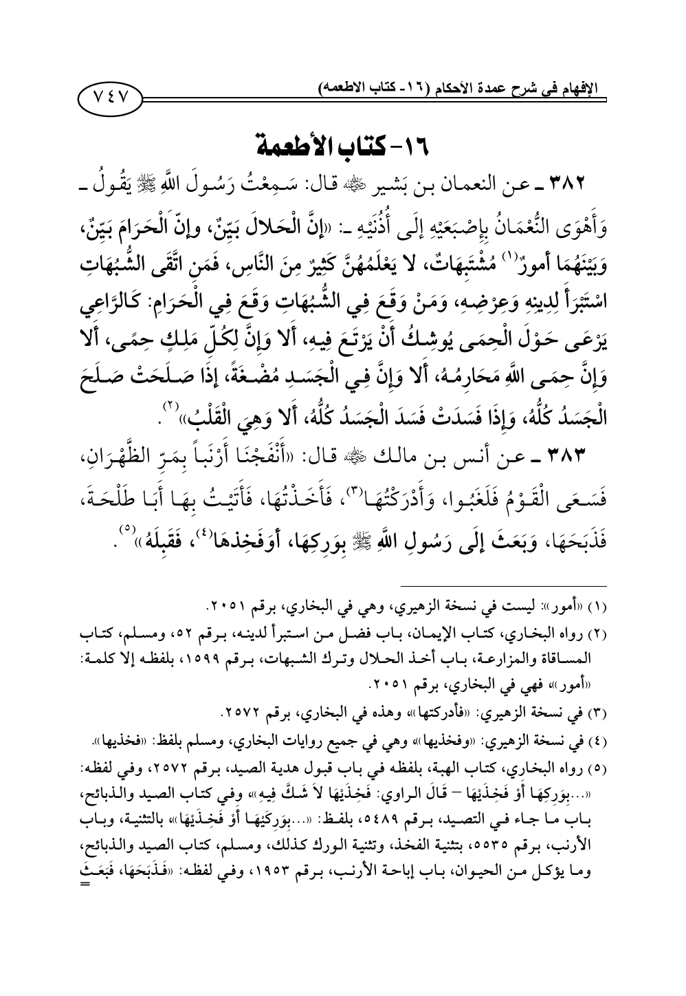 382 - عن النعمان بن بَشير - رضي الله عنه - قال: سَمِعْتُ رَسُولَ اللَّهِ - صلى الله عليه وسلم - يَقُولُ ــ وَأَهْوَى النُّعْمَانُ بِإِصْبَعَيْهِ إلَى أُذُنَيْهِ ــ: «إنَّ الْحَلالَ بَيِّنٌ، وإنَّ الْحَرَامَ بَيِّنٌ، وَبَيْنَهُمَا أمورٌ (¬1) مُشْتَبِهَاتٌ، لا يَعْلَمُهُنَّ كَثِيرٌ مِنَ النَّاسِ، فَمَنِ اتَّقَى الشُّبُهَاتِ اسْتَبْرَأَ لِدِينِهِ وَعِرْضِهِ، وَمَنْ وَقَعَ فِي الشُّبُهَاتِ وَقَعَ فِي الْحَرَامِ: كَالرَّاعِي يَرْعَى حَوْلَ الْحِمَى يُوشِكُ أَنْ يَرْتَعَ فِيهِ، أَلا وَإِنَّ لِكُلِّ مَلِكٍ حِمًى، أَلا وَإِنَّ حِمَى اللَّهِ مَحَارِمُهُ، أَلا وَإِنَّ فِي الْجَسَدِ مُضْغَةً، إذَا صَلَحَتْ صَلَحَ الْجَسَدُ كُلُّهُ، وَإِذَا فَسَدَتْ فَسَدَ الْجَسَدُ كُلُّهُ، أَلا وَهِيَ الْقَلْبُ» (¬2).