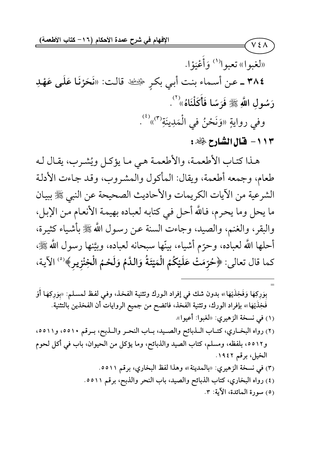 384 - عن أسماء بنت أبي بكرٍ - رضي الله عنهما - قالت: «نَحَرْنَا عَلَى عَهْدِ رَسُولِ اللَّهِ - صلى الله عليه وسلم - فَرَسًا فَأَكَلْنَاهُ» (¬2).