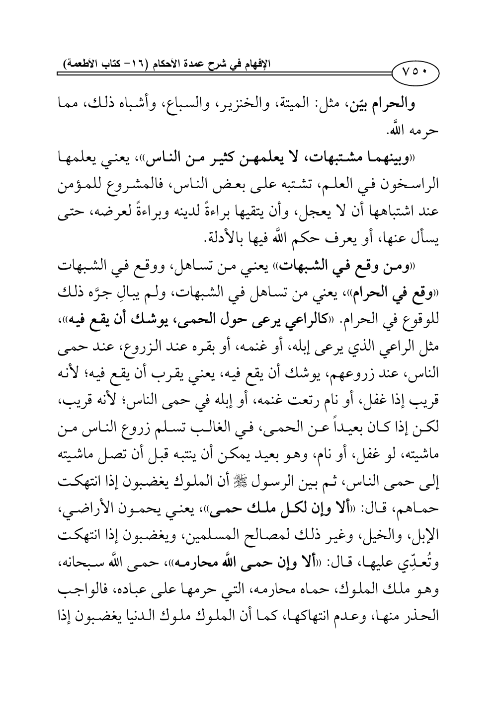 «ومن وقع في الشبهات» يعني من تساهل، ووقع في الشبهات «وقع في الحرام»، يعني من تساهل في الشبهات، ولم يبالِ جرَّه ذلك للوقوع في الحرام. «كالراعي يرعى حول الحمى، يوشك أن يقع فيه»، مثل الراعي الذي يرعى إبله، أو غنمه، أو بقره عند الزروع، عند حمى الناس، عند زروعهم، يوشك أن يقع فيه، يعني يقرب أن يقع فيه؛ لأنه قريب إذا غفل، أو نام رتعت غنمه، أو إبله في حمى الناس؛ لأنه قريب، لكن إذا كان بعيداً عن الحمى، في الغالب تسلم زروع الناس من ماشيته، لو غفل، أو نام، وهو بعيد يمكن أن ينتبه قبل أن تصل ماشيته إلى حمى الناس، ثم بين الرسول - صلى الله عليه وسلم - أن الملوك يغضبون إذا انتهكت حماهم، قال: «ألا وإن لكل ملك حمى»، يعني يحمون الأراضي, الإبل، والخيل، وغير ذلك لمصالح المسلمين، ويغضبون إذا انتهكت وتُعدِّي عليها، قال: «ألا وإن حمى اللَّه محارمه»، حمى اللَّه سبحانه، وهو ملك الملوك، حماه محارمه، التي حرمها على عباده، فالواجب الحذر منها، وعدم انتهاكها، كما أن الملوك ملوك الدنيا يغضبون إذا