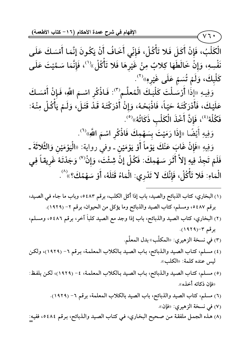 (¬8) هذه الجمل ملفقة من صحيح البخاري، في كتاب الصيد والذبائح، برقم 5484، ففيه: «وإن رميت الصيد فوجدته بعد يومٍ، أو يومين ليس به إلا أثر سهمك، فكل، وإن وقع في الماء فلا تأكل»، وقوله: «اليومين والثلاثة» رواية البخاري، برقم 5485، وقوله: «فإن وجدته غريقاً في الماء فلا تأكل فإنك لا تدري الماء قتله، أو سهمك»، هذه الرواية ملفقة من صحيح مسلم، برقم 7 - (1929)، ورقم 6 - (1929).