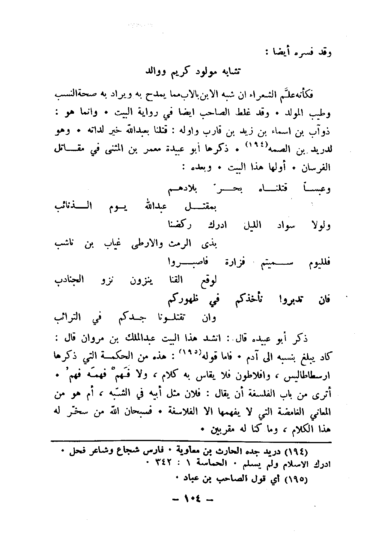 ذكر أبو عبيدة قال: أنشد هذا البيت عبد الملك بن مروان قال: كاد يبلغ بنسبه إلى آدم. فأما قوله: هذه من الحكمة التي ذكرها ارسطاليس، وأفلاطون فلا يقاس به كلام، ولا فهم فهمه فهم. أترى من باب الفلسفة أن يقال: فلان مثل أبيه في الشبه، أم هو من المعاني الغامضة التي لا يفهمها إلا الفلاسفة. فسبحان الله من سخر له هذا الكلام، وما كنا له مقرنين.