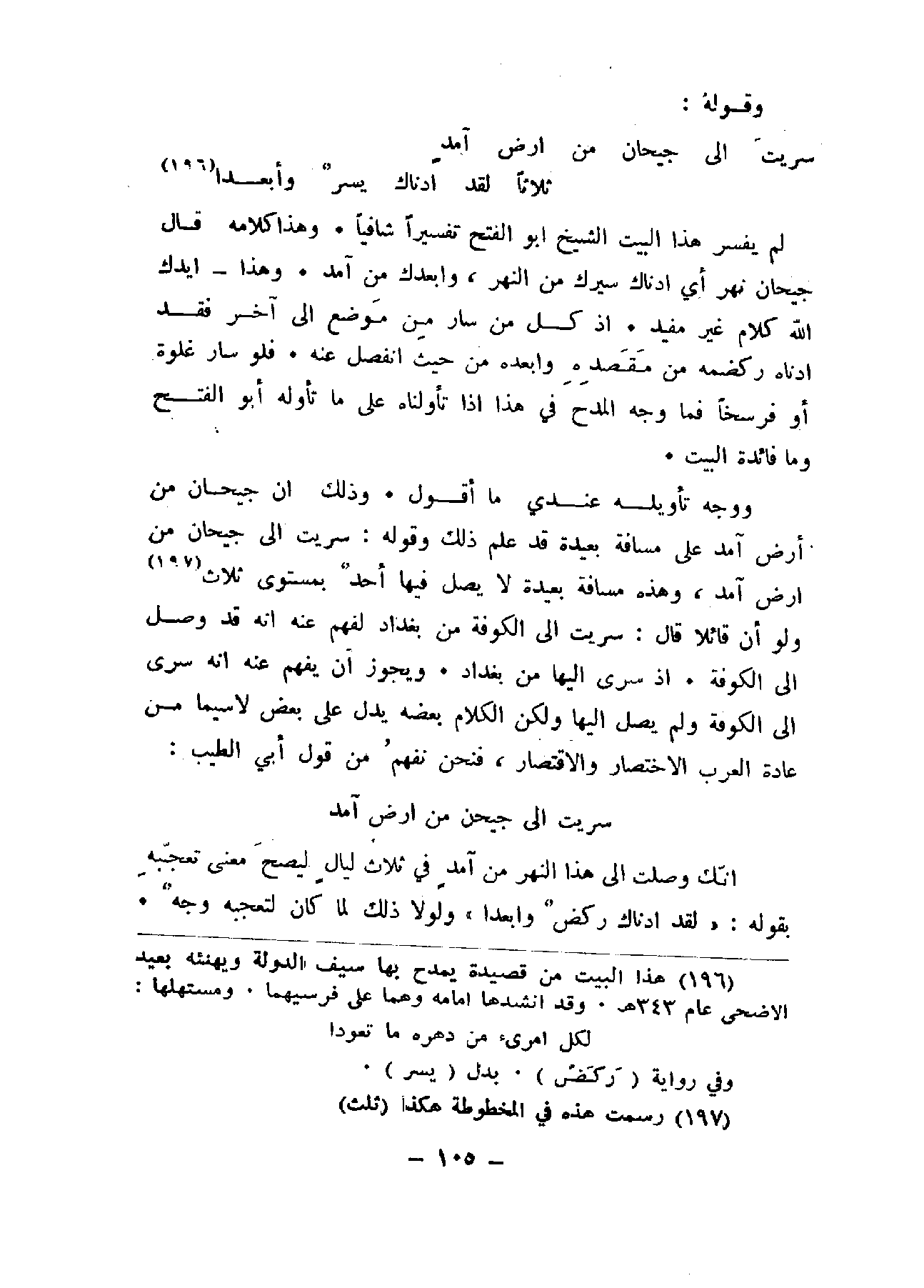 ووجه تأويله عندي ما أقول. وذلك أن جيحان من أرض آمد على مسافة بعيدة قد علم ذلك وقوله: سريت إلى جيحان من أرض آمد، وهذه مسافة بعيدة لا يصل فيها أحد بمستوى ثلاث ولو أن قائلا قال: سريت إلى الكوفة من بغداد لفهم عنه إنه قد وصل إلى الكوفة. إذ سرى إليها من بغداد. ويجوز أن يفهم عنه إنه سرى إلى الكوفة ولم يصل إليها ولكن الكلام بعضه يدل على بعض لاسيما من عادة العرب الاختصار والاقتصار، فنحن نفهم من قول أبي الطيب: