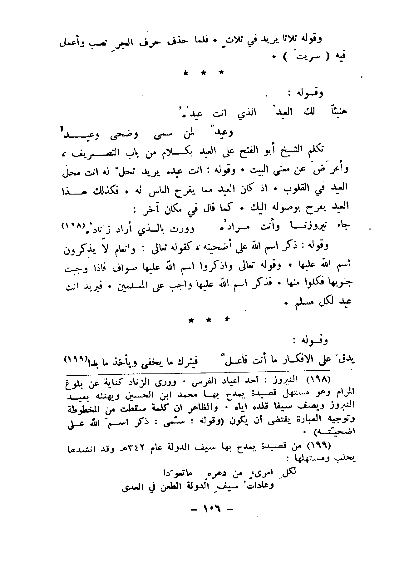 تكلم الشيخ أبو الفتح على العيد بكلام من باب التصريف، وأعرض عن معنى البيت. وقوله: أنت عيده يريد تحل له أنت محل العيد في القلوب. إذ كان العيد مما يفرح الناس له. فكذلك هذا العيد يفرح بوصوله إليك. كما قال في مكان آخر: