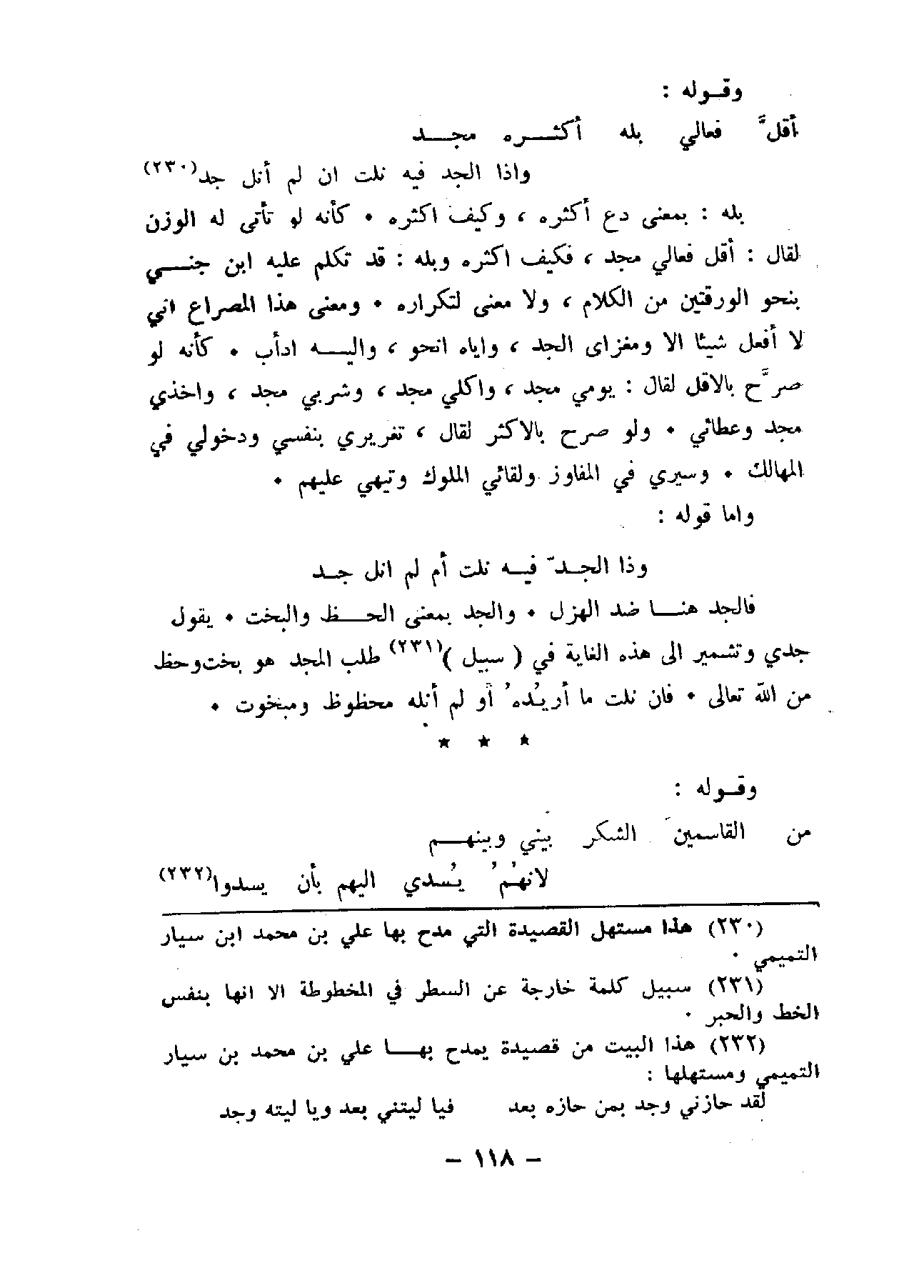 لتكراره. ومعنى هذا المصراع أني لا أفعل شيئاً إلا ومغزاي الجد، وإياه أنحو، وإليه أدأب. كأنه لو صرح بالأقل لقال: يومي مجد وأكلي مجد، وشربي مجد، وأخذي مجد وعطائي. ولو صرح بالأكثر لقال، تغريري بنفسي ودخولي في المهالك. وسيري في المفاوز ولقائي الملوك وتيهي عليهم.