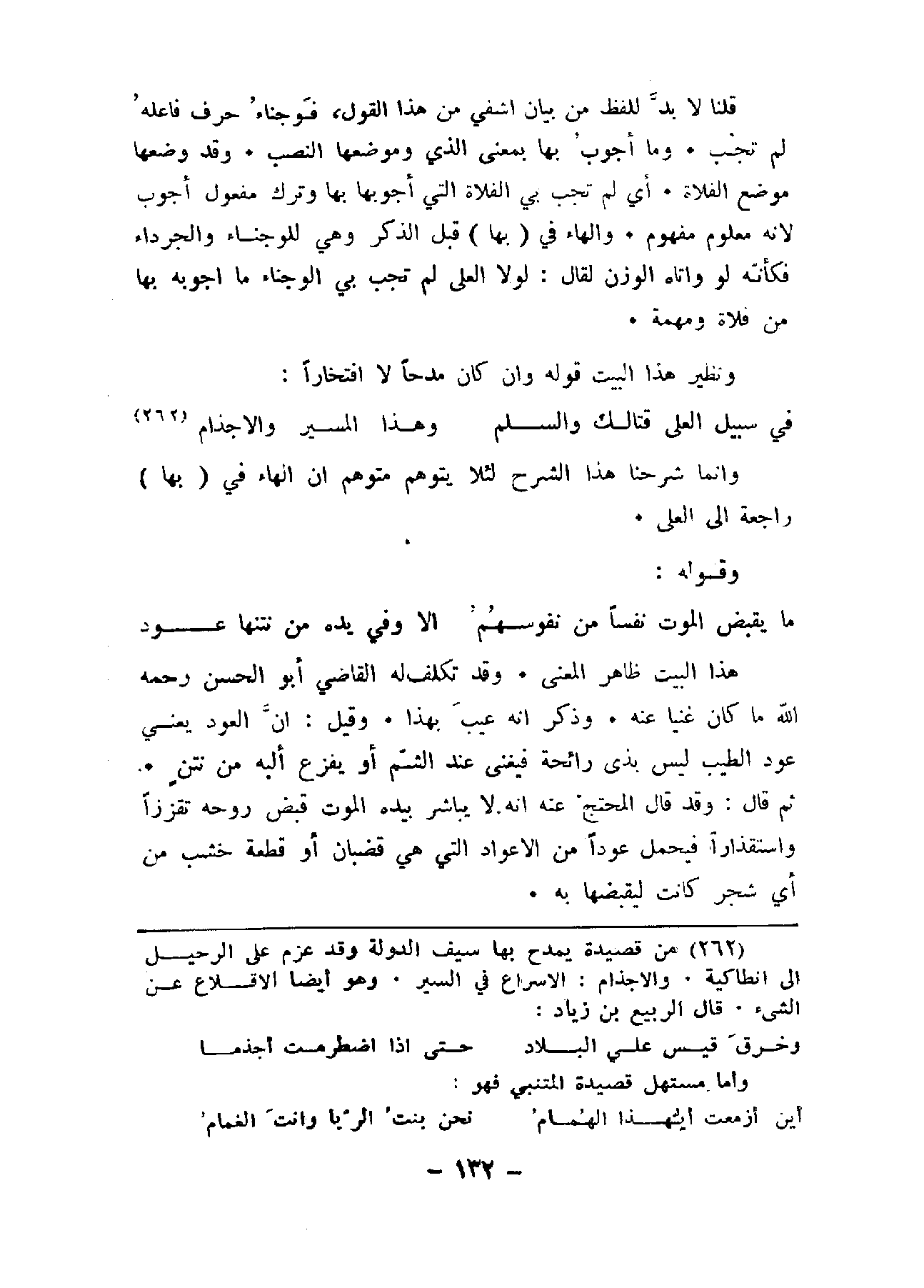 قلنا لابد للفظ من بيان اشفي من هذا القول، فوجناء حرف فاعله لم تجب. وما أجوب بها بمعنى الذي وموضعها النصب. وقد وضعها موضع الفلاة. أي لم تجب بي الفلاة التي أجوبها بها وترك مفعول أجوب لأنه معلوم مفهوم. والهاء في (بها) قبل الذكر وهي للوجناء والجرداء فكأنه لو واتاه الوزن لقال: لولا العلي لم تجب بي الوجناء ما أجوبه بها من فلاة ومهمة.