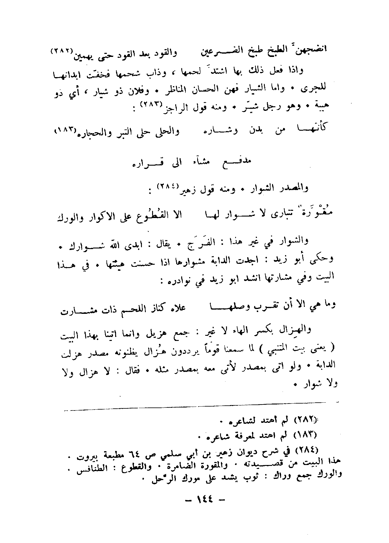 والهزال بكسر الهاء لا غير: جمع هزيل وإنما أتينا بهذا البيت (يعني بيت المتنبي) لما سمعنا قوماً يرددون هزال يظنونه مصدر هزلت الدابة. ولو أتى بمصدر لأتى معه بمصدر مثله. فقال: لا هزال ولا شوار.