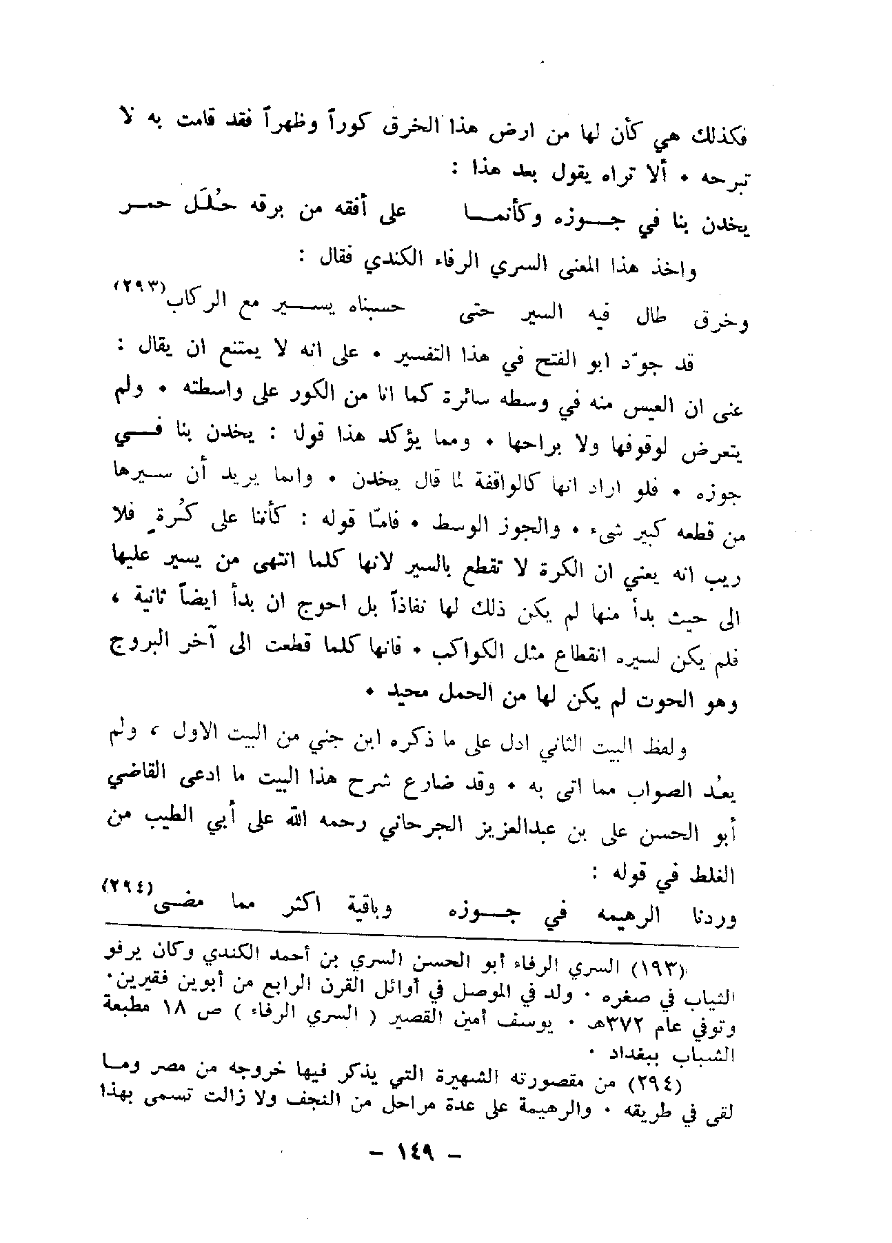 قد جود أبو الفتح في هذا التفسير. على إنه لا يمتنع أن يقال: غنى أن العيس منه في وسطه سائرة كما أنا من الكور على وساطته. ولم يتعرض لوقوفها ولا براحها. ومما يؤكد هذا قوله: يخدن بنا في جوزه. فلو أراد إنها كالواقفة لما قال يخدن. وإنما يريد أن سيرها من قطعة كبير شيء. والجوز الوسط. فأما قوله: كأننا على كرة فلا ريب إنه يعني أن الكرة لا تقطع بالسير لأنها كلما انتهى من يسير عليها إلى حيث بدأ منها لم يكن ذلك لها نفاذاً بل أحوج إن بدأ أيضاً ثانية، فلم يكن لسيره انقطاع مثل الكواكب. فإنها كلما قطعت إلى آخر البروج وهو الحوت لم يكن لها من الحمل محيد.