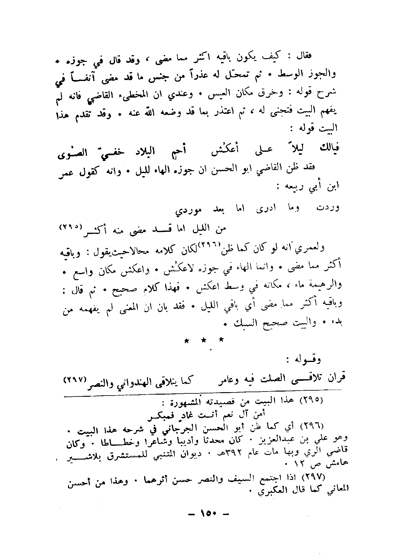 فقال: كيف يكون باقية أكثر مما مضى، وقد قال في جوزه. والجوز وسط. ثم تمحل له عذراً من جنس ما قد مضى أنفاً في شرح قوله: وخرق مكان العيس. وعندي أن المخطئ القاضي فإنه لم يفهم البيت فتجنى له، ثم اعتذر بما قد وضعه الله عنه. وقد تقدم هذا البيت قوله: