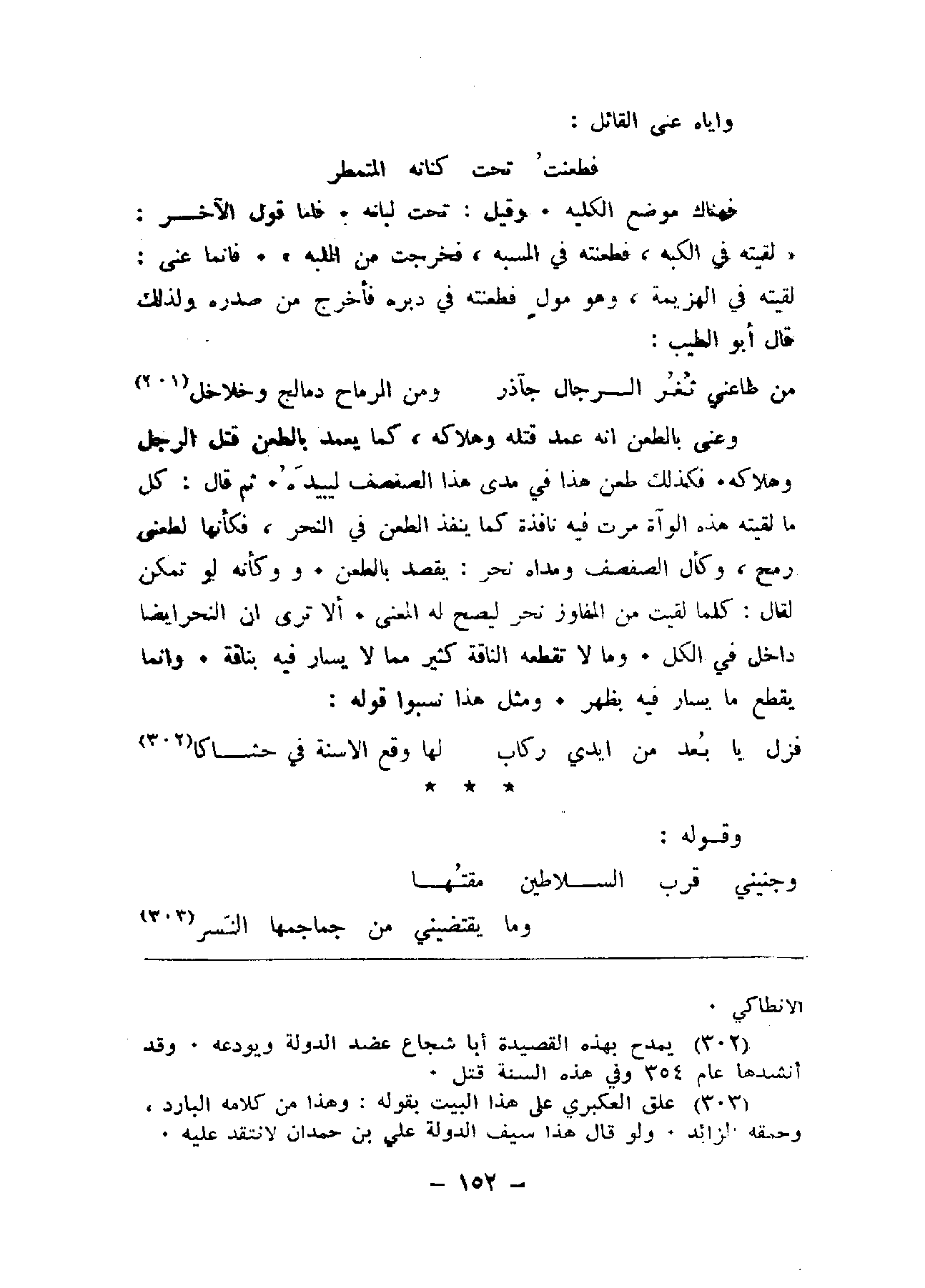 وعنى بالطعن إنه عمد قتله وهلاكه، كما يعمد بالطعن قتل الرجل وهلاكه. فكذلك طعن هذا في مدى هذا الصفصف ليبيده. ثم قال: كل ما لقيته هذه الوآة مرت فيه نافذة كمن ينفذ الطعن في النحر، فكأنها لطعني رمح، وكأل الصفصف ومداه نحر: يقصد بالطعن. وكأنه لو تمكن لقال: كلما لقيت من المفاوز نحو ليصح له المعنى. ألا ترى إن النحر أيضا داخل في الكل. وما لا تقطعه الناقة كثير مما لا يسار فيه بناقة. وإنما يقطع ما يسار فيه بظهر. ومثل هذا نسبوا قوله: