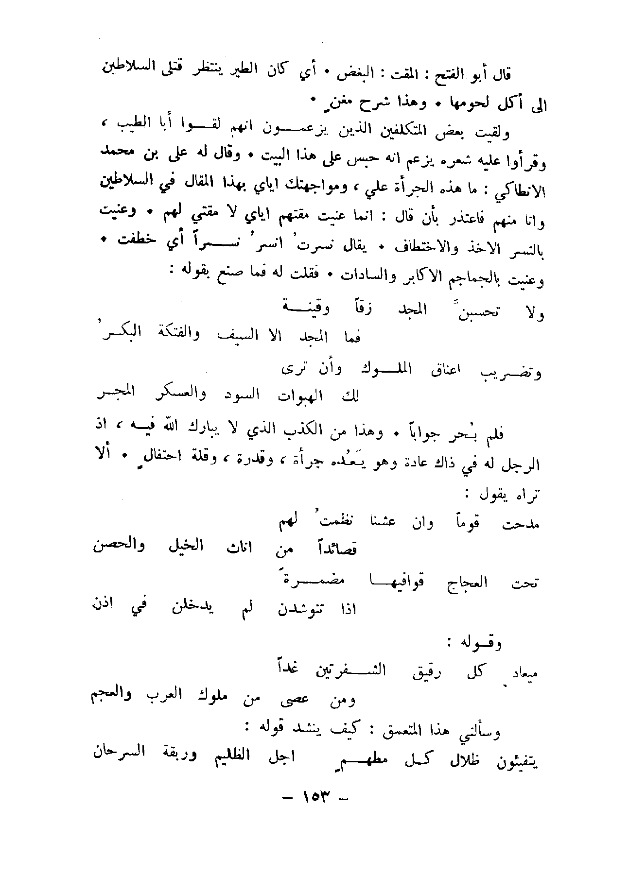 ولقيت بعض المتكلفين الذين يزعمون انهم لقوا أبا الطيب، وقرءوا عليه شعره يزعم إنه حبس على هذا البيت. وقال له علي بن محمد الانطاكي: ما هذه الجرأة علي، ومواجهتك إياي بهذا المقال في السلاطين وأنا منهم فاعتذر بأن قال: إنما عنيت مقتهم إياي لا مقتي لهم. وعنيت بالنسر الأخذ والاختطاف. يقال نسرت أنسر نسراً أي خطفت. وعنيت بالجماجم الأكابر والسادات. فقلت له فما صنع بقوله: