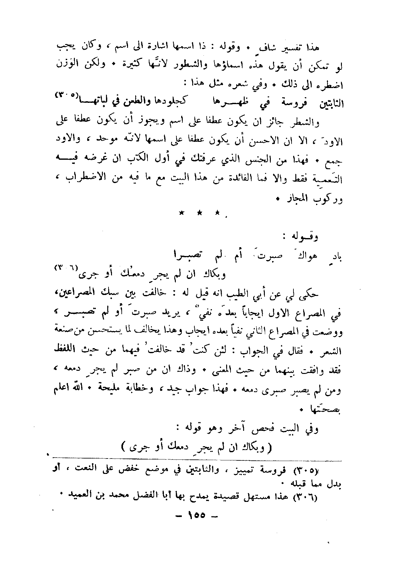 حكى لي عن أبي الطيب إنه قيل له: خالفت بين سبك المصراعين، في المصراع الأول إيجاز بعده نفي، يريد صبرت أو لم تصبر، ووضعت في المصراع الثاني نفياً بعده إيجاب وهذا يخالف لما يستحسن من صنعة الشعر. فقال في الجواب: لئن كنت قد خالفت فيهما من حيث اللفظ فقد وافقت بينهما من حيث المعنى. وذاك إن من صبر لم يجر دمعه، ومن لم يصبر صبرى دمعه. فهذا جواب جيد، وخطابة مليحة. الله اعلم بصحتها.