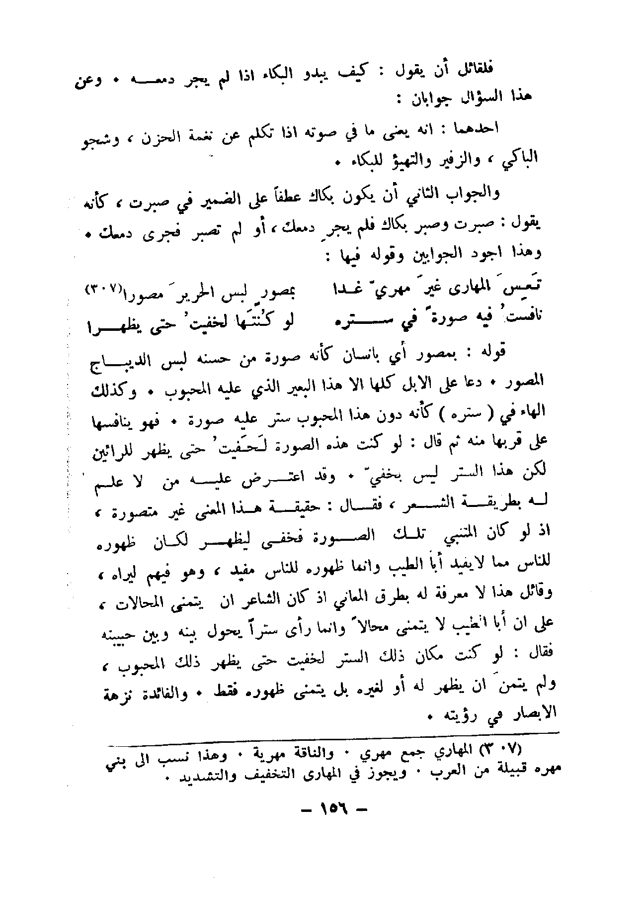 قوله: بمصور أي بإنسان كأنه صورة من حسنه لبس الديباج المصور. دعا على الإبل كلها إلا هذا البعير الذي عليه المحبوب. وكذلك الهاء في (ستره) كأنه دون هذا المحبوب ستر عليه صورة. فهو ينافسها على قربها منه ثم قال: لو كنت هذه الصورة لحفيت حتى يظهر للرائين لكن هذا الستر ليس بخفي. وقد اعترض عليه من لا أعلم له بطريقة الشعر، فقال: حقيقة هذا المعنى غير متصورة، إذ لو كان المتنبي تلك الصورة فخفي ليظهر لكان ظهوره للناس مما لا يفيد أبا الطيب وإنما ظهوره للناس مفيد، وهو فيهم ليراه، وقائل هذا لا معرفة له بطرق المعاني إذ كان الشاعر أن يتمنى المحالات، على أن أبا الطيب لا يتمنى محالا وإنما رأى ستراً يحول بينه وبين حبيبته فقال: لو كنت مكان ذلك الستر لخفيت حتى يظهر ذلك المحبوب، ولم يتمن أن يظهر له أو لغيره بل يتمنى ظهوره فقط. والفائدة نزهة الأبصار في رؤيته.