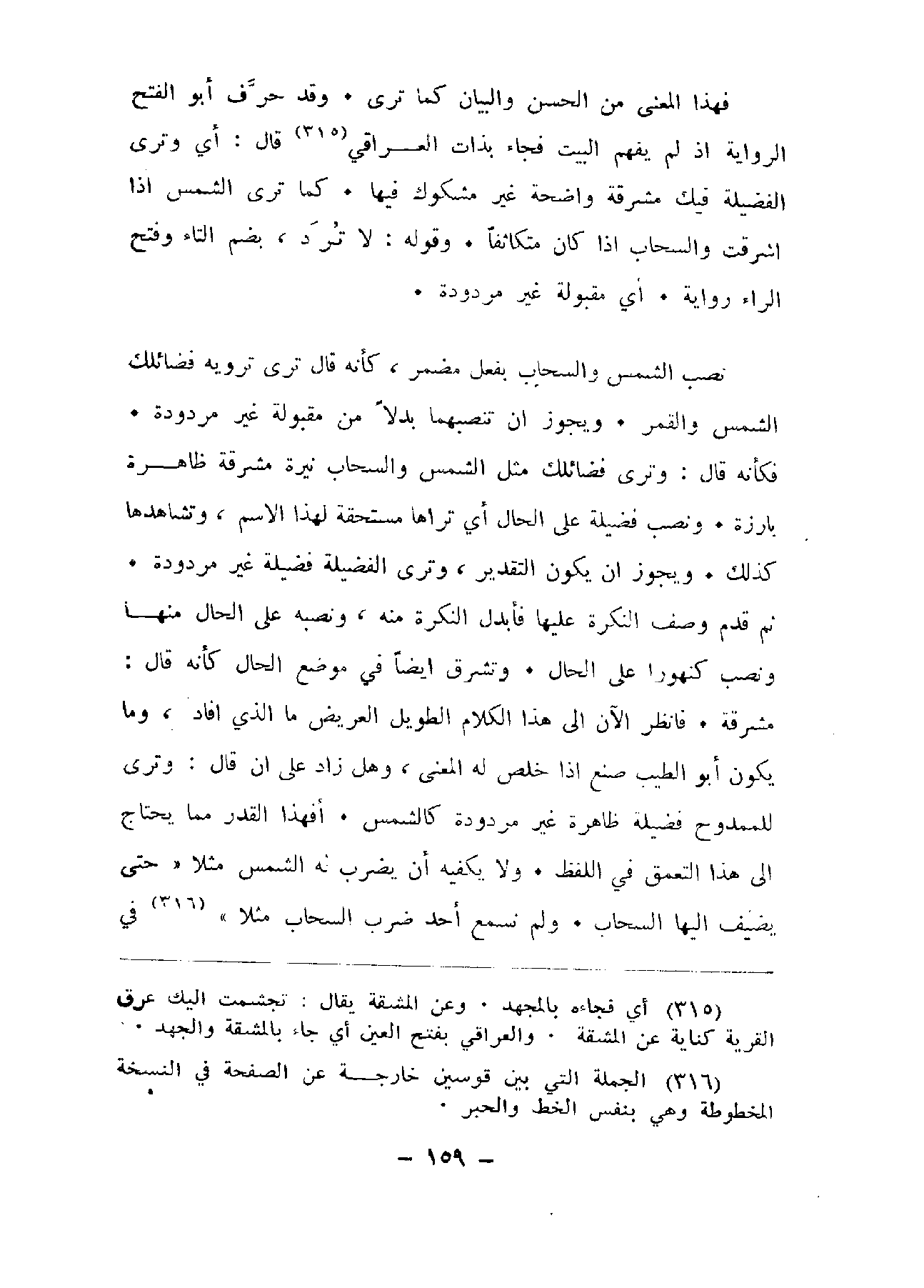 نصب الشمس والسحاب بفعل مضمر، كأنه قال ترى ترويه فضائلك الشمس والقمر. ويجوز أن تنصبها بدلاً من مقبولة غير مردودة. فكأنه قال: وترى فضائلك مثل الشمس والسحاب نيرة مشرقة ظاهرة بارزة. ونصب فضيلة على الحال أي تراها مستحقة لهذا الاسم، وتشاهدها كذلك. ويجوز أن يكون التقدير، وترى الفضيلة فضيلة غير مردودة. ثم قدم وصف النكرة عليها فأبدل النكرة منه، ونصبه على الحال منها ونصب كنهورا على الحال. وتشرق أيضاً في موضع الحال كأنه قال مشرقة. فانظر الآن إلى هذا الكلام الطويل العريض ما الذي افاد، وما يكون أبو الطيب صنع إذا خلص له المعنى، وهل زاد على إن قال: ونرى للممدوح فضيلة ظاهرة غير مردودة كالشمس. أفهذا القدر مما يحتاج إلى هذا التعميق في اللفظ. ولا يكفيه أن يضرب له الشمس مثلا (حتى يضيف إليها السحاب. ولم نسمع أحد ضرب السحاب مثلا)