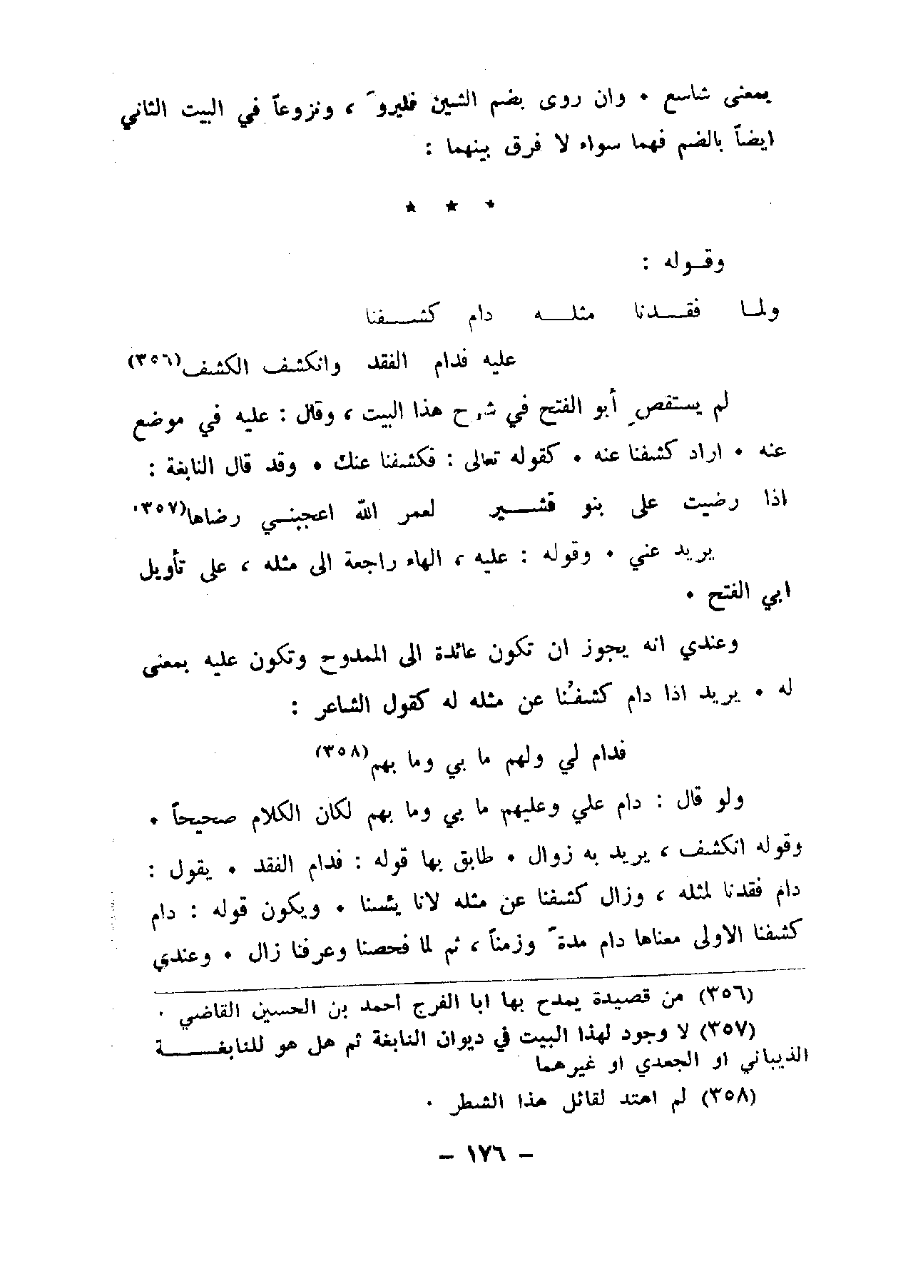 ولو قال: دام علي وعليهم ما بي وما بهم لكان الكلام صحيحاً. وقوله انكشف، يريد به زوال. طابق بها قوله: فدام الفقد. يقول: دام فقدنا لمثله، وزال كشفنا عن مثله لانا يئسنا. ويكون قوله: دام كشفنا الأولى معناها دام مدة وزمنا، ثم لما