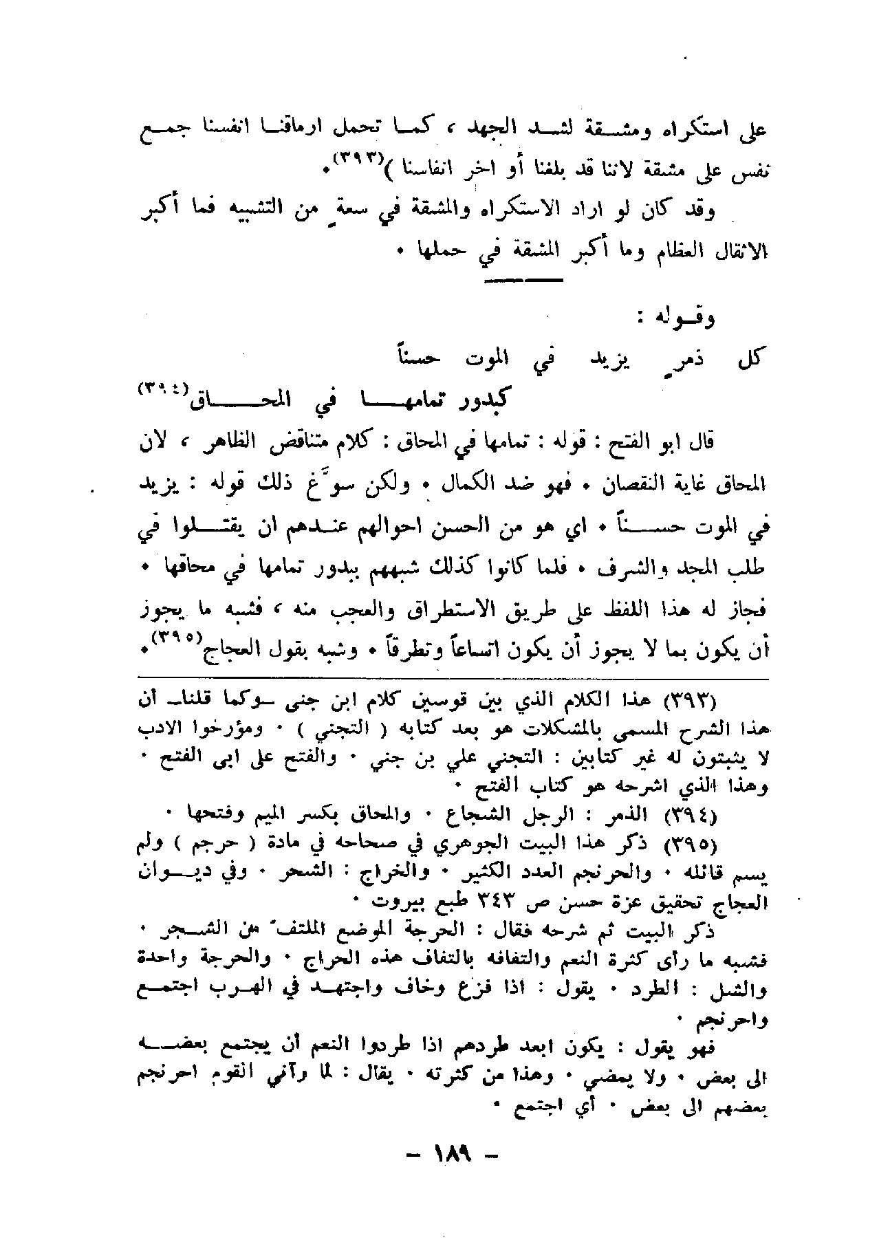 قال أبو الفتح: قوله: تمامها في المحاق: كلام متناقض الظاهر، لأن المحاق غاية النقصان. فهو ضد الكمال. ولكن سوغ ذلك قوله: يزيد في الموت حسناً. أي هو من الحسن أحوالهم عندهم أن يقتلوا في طلب المجد والشرف. فلما كانوا كذلك شبههم ببدور تمامها في محاقها. فجاز له هذا اللفظ على طريق الاستطراق والعجب منه، فشبه ما يجوز أن يكون بما لا يجوز أن يكون اتساعاً وتطرقاً. وشبه بقول العجاج.