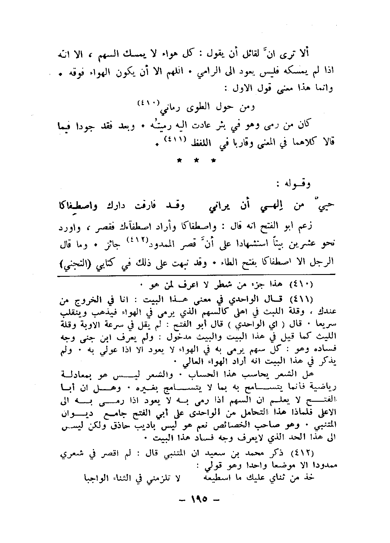 زعم أبو الفتح إنه قال: واصطفاكا وأراد اصطفاءك فقصر، وأورد نحو عشرين بيتاً استشهاداً على أن قصر الممدود جائز. وما قال الرجل إلا اصطفاكا بفتح الطاء. وقد نبهت على ذلك في كتابي (التجني)