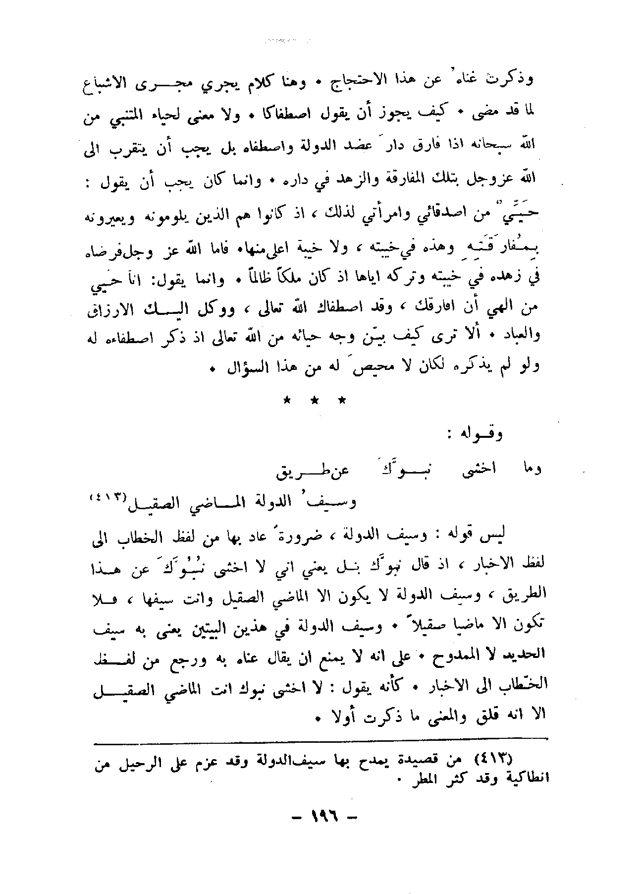 ليس قوله: وسيف الدولة، ضرورة عاد بها من لفظ الخطاب إلى لفظ الأخبار، إذ قال نبوك بل يعني أني لا أخشى نبوك عن هذا الطريق، وسيف الدولة لا يكون إلا الماضي الصقيل وأنت سيفها، فلا تكون إلا ماضياً صقيلا. وسيف الدولة في هذين البيتين يعني به سيف الحديد لا الممدوح. على إنه لا يمنع أن يقال عناه به ورجع من لفظ الخطاب إلى الأخبار. كأنه يقول: لا أخشى نبوك أنت الماضي الصقيل إلا إنه قلق والمعنى ما ذكرت أولا.