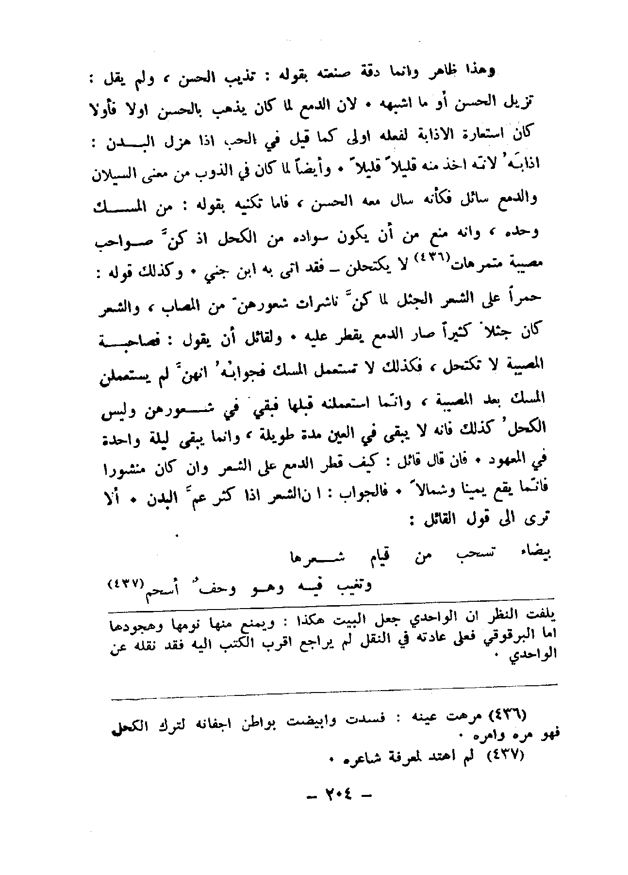 وهذا ظاهر وإنما دقة صنعته بقوله: تذيب الحسن، ولم يقل: تزيل الحسن أو ما أشبهه. لأن الدمع لما كان يذهب بالحسن أولاً فأولاً كان استعارة الإذابة لفعله أولى كما قيل في الحب إذا هزل البدن: أذابه لأنه اخذ منه قليلاً قليلا. وأيضاً لما كان في الذوب من معنى السيلان والدمع سائل فكأن سال معه الحسن، فأما تكنيه بقوله: من المسك وحده، وإنه منع من أن يكون سواده من الكحل إذ كن صواحب مصيبة متمرهات لا يكتحلن فقد أتى به ابن جني. وكذلك قوله: حمراً على الشعر الجثل لما كن ناشرات شعورهن من المصاب، والشعر كان جثلا كثيراً صار الدمع يقطر عليه. ولقائل أن يقول: فصاحبه المصيبة لا تكتحل، فكذلك لا تستعمل المسك فجوابه إنهن لم ستعملن المسك بعد المصيبة، وإنما استعملنه قبلها فبقي في شعورهن وليس الكحل كذلك فإنه لا يبقى في العين مدة طويلة، وإنما يبقى ليلة واحدة في المعهود. فإن قال قائل: كيف قطر الدمع على الشعر وان كان منشوراً فإنما يقع يميناً وشمالا. فالجواب: إن الشعر إذا كثر عم البدن. ألا ترى إلى قول القائل: