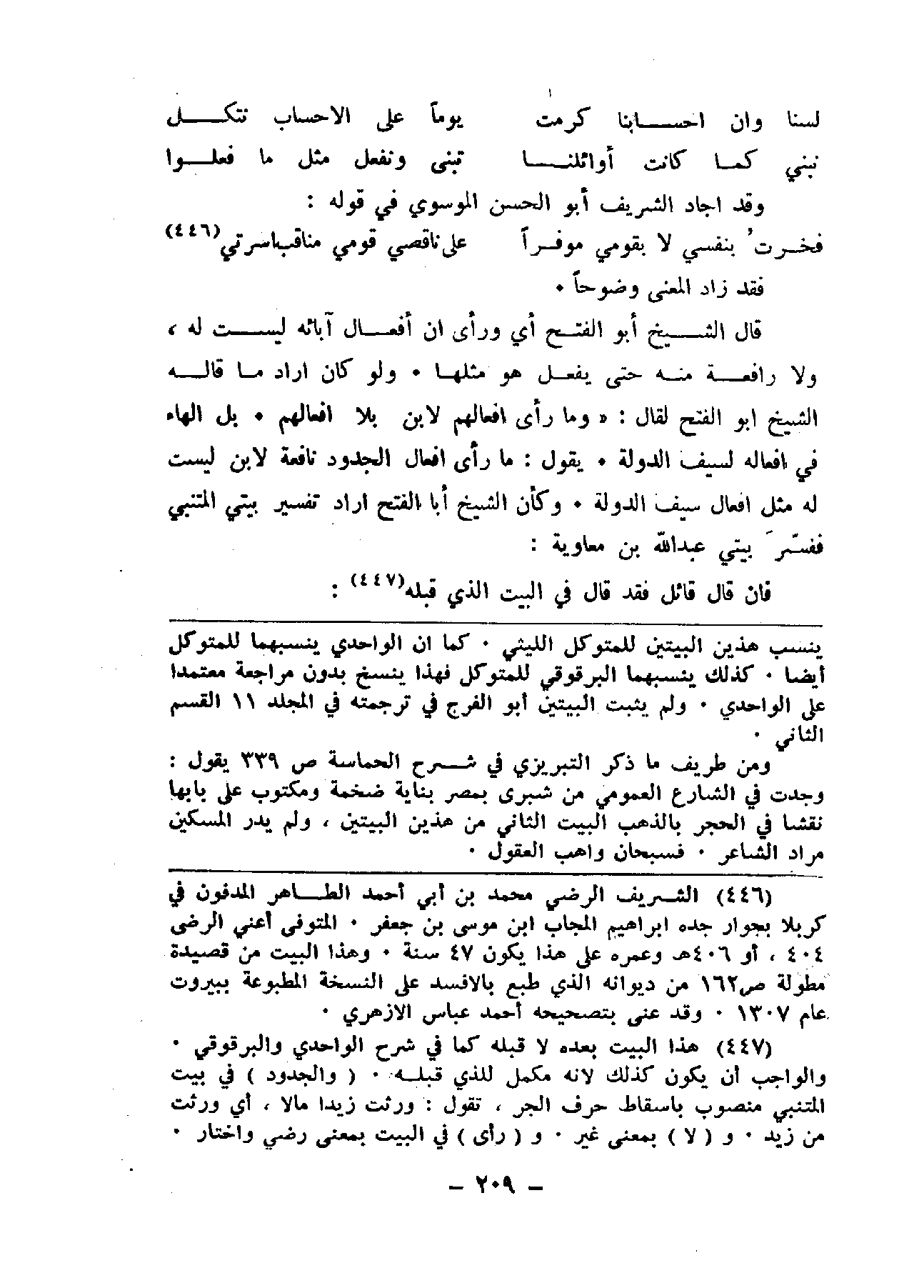 قال الشيخ أبو الفتح أي ورأى أن أفعال آبائه ليست له، ولا رافعة منه حتى يفعل هو مثلها. ولو كان أراد ما قاله الشيخ أبو الفتح لقال: (وما رأى أفعالهم لابن لأفعالهم. بل الهاء في أفعاله لسيف الدولة. يقول: ما رأى أفعال الجدود نافعة لابن ليست له مثل أفعال سيف الدولة. وكأن الشيخ أبا الفتح أراد تفسير بيتي المتنبي ففسر بيتي عبد الله بن معاوية: