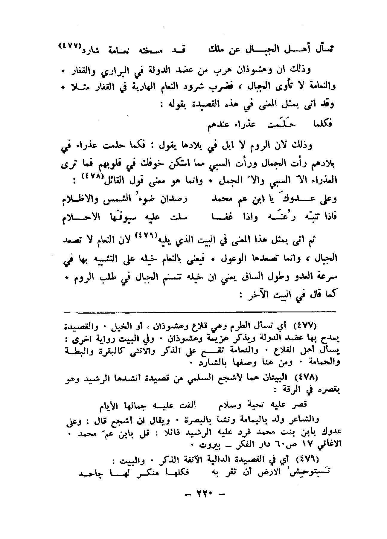 ثم أتى بمثل هذا المعنى في البيت الذي يليه لأن النعام لا تصعد الجبال، وإنما تصعد الوعول. فيعني بالنعام خيله على التشبيه بها في سرعة العدو وطول الساق يعني أن خيله تتسنم الجبال في طلب الروم كما قال في البيت الآخر: