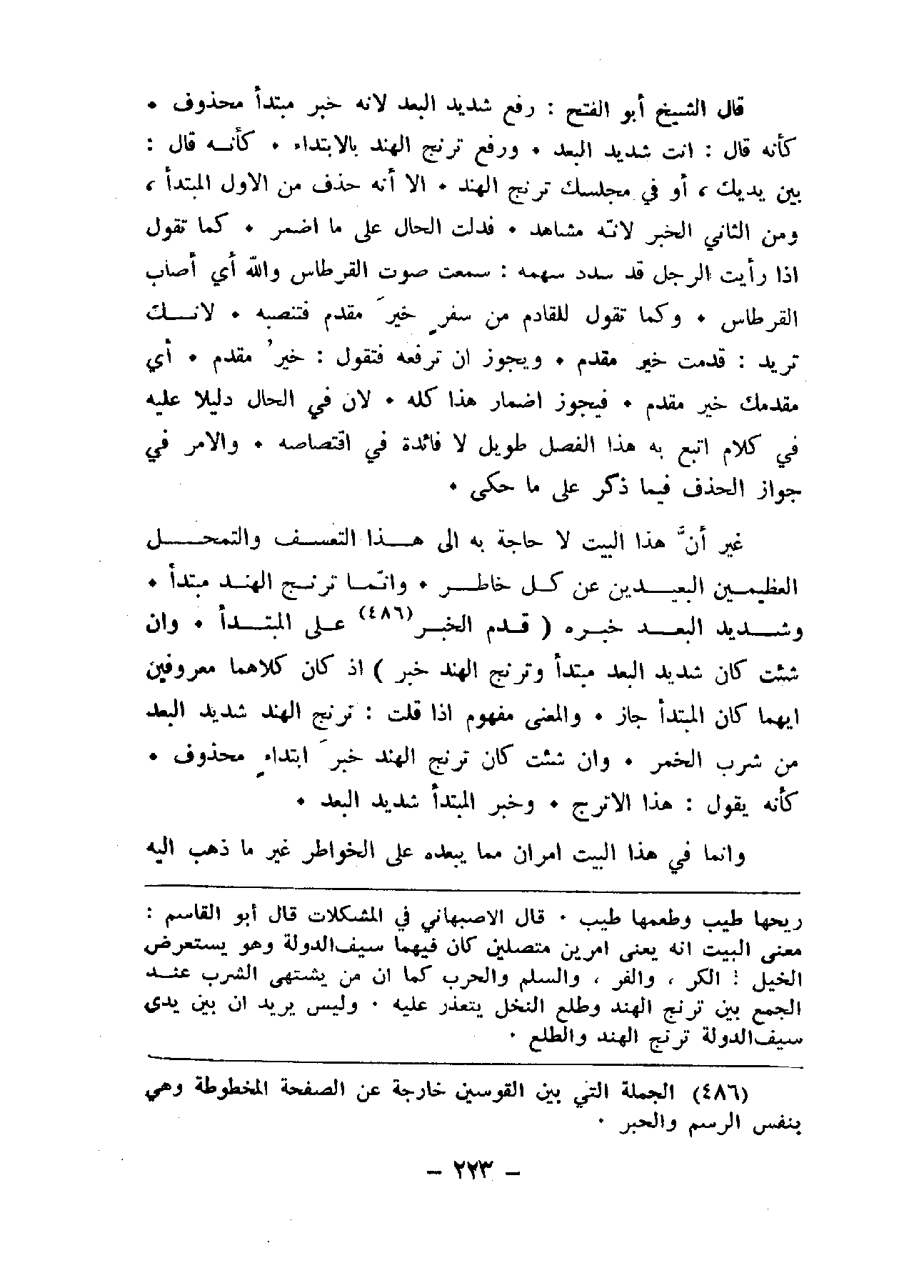 قال الشيخ أبو الفتح: رفع شديد البعد لأنه خبر مبتدأ محذوف. كأنه قال: أنت شديد البعد. ورفع ترنج الهند بالابتداء. كأنه قال: بين يديك، أو في مجلسك ترنج الهند. إلا إنه حذف من الأول المبتدأ، ومن الثاني الخبر لأنه مشاهد. فدلت الحال على ما أضمر. كما تقول إذا رأيت الرجل قد سدد سهمه: سمعت صوت القرطاس والله أي أصاب القرطاس. وكما تقول للقادم من سفر خير مقدم فتنصبه. لأنك تريد: قدمت خير مقدم. فيجوز إضمار هذا كله. لأن في الحال دليلا عليه في كلام أتبع به هذا الفصل طويل لا فائدة في اقتصاصه. والأمر في جواز الحذف فيما ذكر على ما حكى.