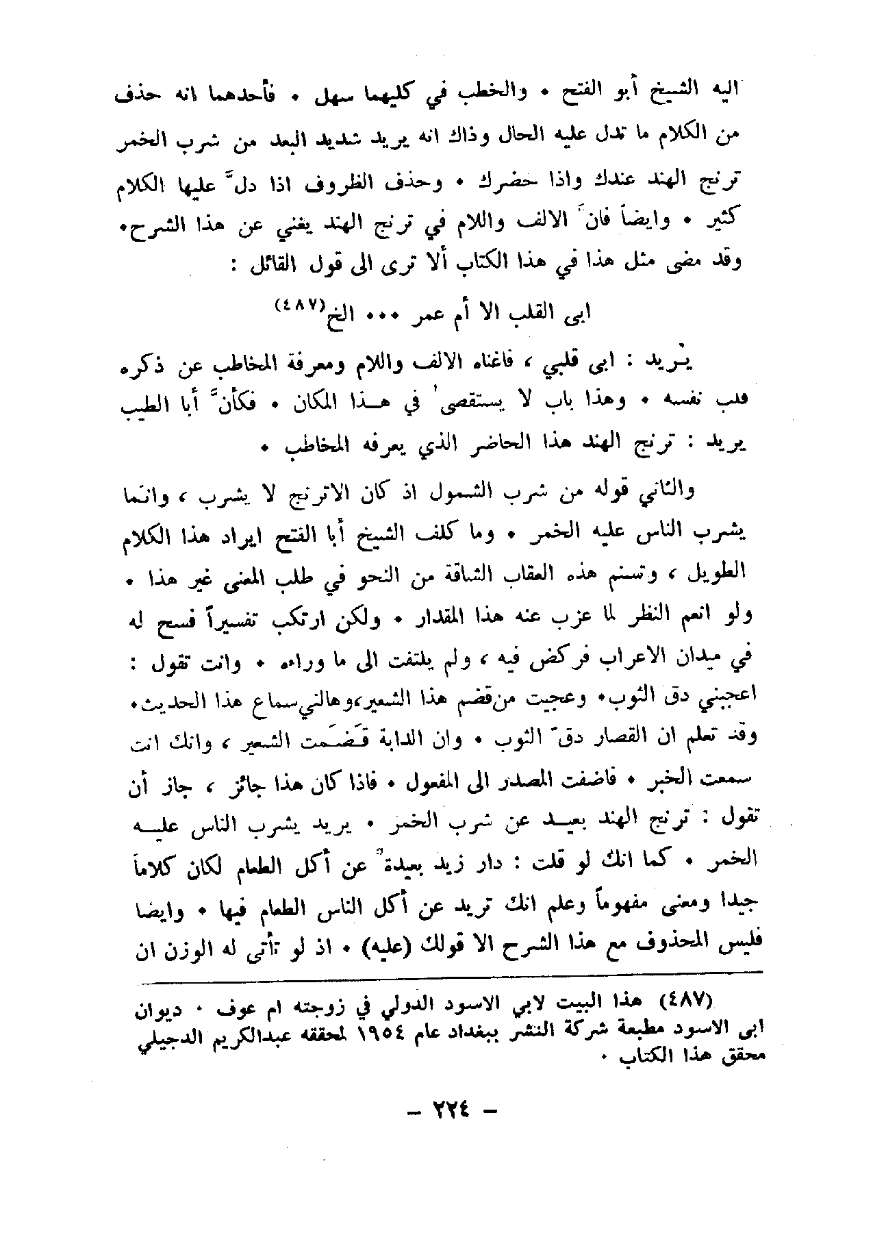 الشيخ أبو الفتح. والخطب في كليهما سهل. فأحدهما إنه حذف من الكلام ما تدل عليه الحال وذاك إنه يريد شديد البعد من شرب الخمر ترنج الهند عندك وإذا حضرك. وحذف الظروف إذا دل عليها الكلام كثير. وأيضا فإن الألف واللام في ترنج الهند يغني عن هذا الشرح. وقد مضى مثل هذا في هذا الكتاب ألا ترى إلى قول القائل: