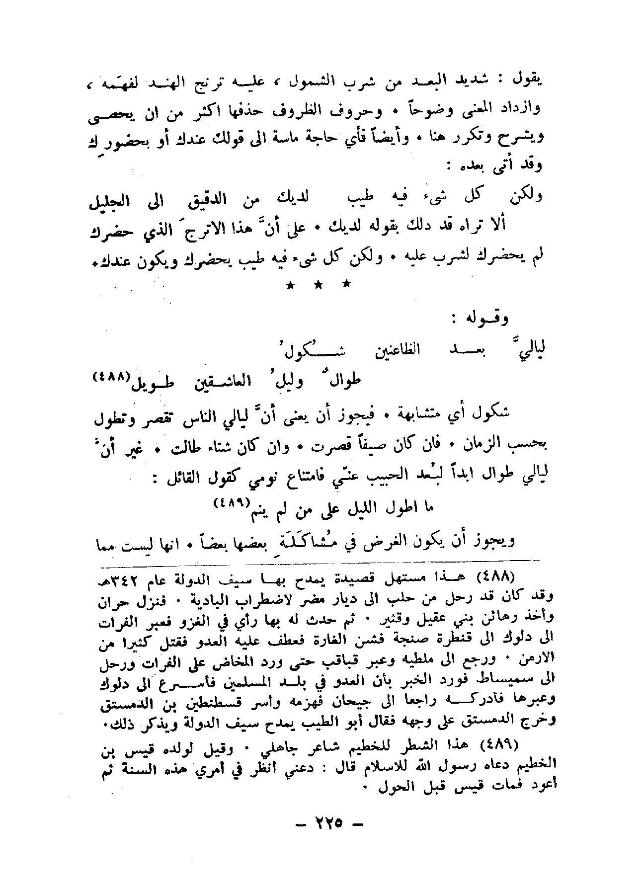 يقول: شديد البعد من شرب الشمول، عليه ترنج الهند لفهمه، وازداد المعنى وضوحاً. وحروف الظروف حذفها أكثر من أن يحصى ويشرح وتكرر هنا. وأيضا فأي حاجة ماسة إلى قولك عندك أو بحضورك وقد أتى بعده:
