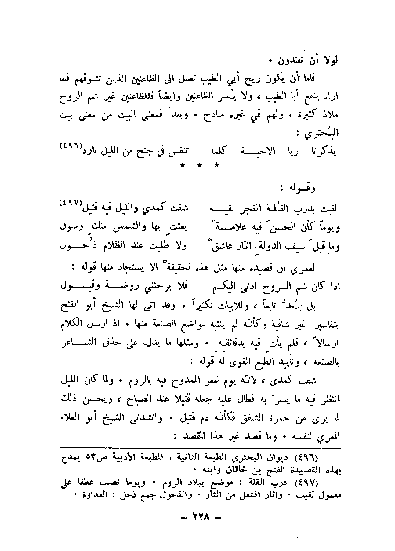 فأما أن يكون ريح أبي الطيب تصل إلى الظاعنين الذين تشوقهم فما أراه ينفع أبا الطيب، ولا يسر الظاعنين وأيضا فللظاعنين غير شم الروح ملاذ كثيرة، ولهم في غير منادح. وبعد فمعنى البيت من معنى بيت البحتري: