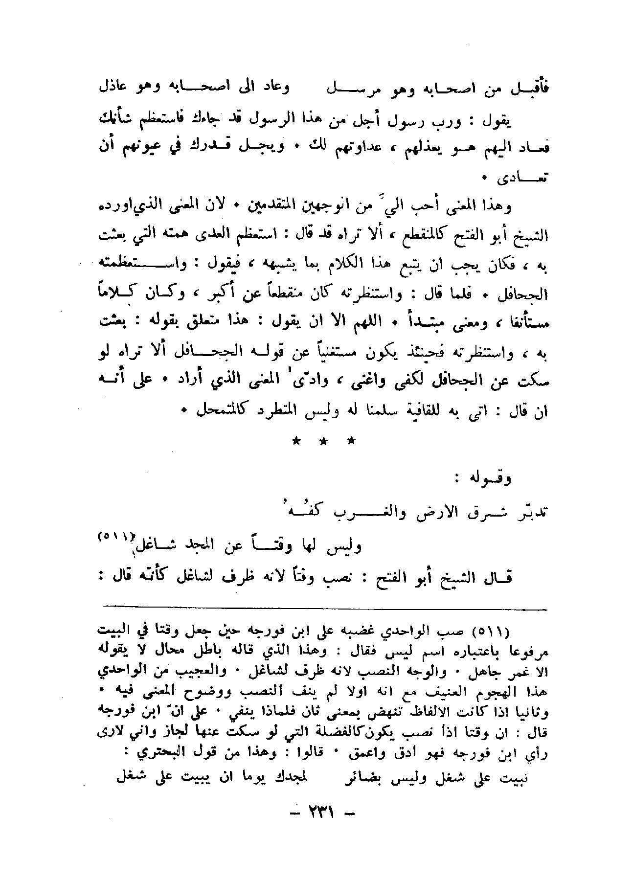 وهذا المعنى أحب إلي من الوجهين المتقدمين. لان المعنى الذي أورده الشيخ أبو الفتح كالمنقطع، ألا تراه قد قال: استعظم العدى همته التي بعثت به، فكان يجب أن يتبع هذا الكلام بما يشبهه، فيقول: واستعظمته الجحافل. فلما قال: واستنظرته كان منقطعاً عن أكبر، وكان كلاماً مستأنفاً، ومعنى مبتدأ. اللهم إلا أن يقول: هذا