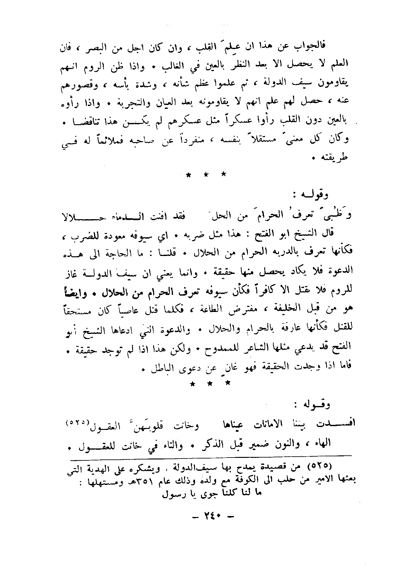 فالجواب عن هذا إن علم القلب، وإن كان أجل من البصر، فإن العلم لا يحصل إلا بعد النظر بالعين في الغالب. وإذا ظن الروم أنهم يقاومون سيف الدولة، ثم علموا عظم شأنه، وشدة بأسه، وقصورهم عنه، حصل لهم علم أنهم لا يقاومنه بعد العيان والتجربة. وإذا رأوه بالعين دون القلب رأوا عسكراً مثل عسكرهم لم يكن هذا تناقضاً. وكان كل معنى مستقلا بنفسه، منفرداً عن صاحبه فملائماً له في طريقته.