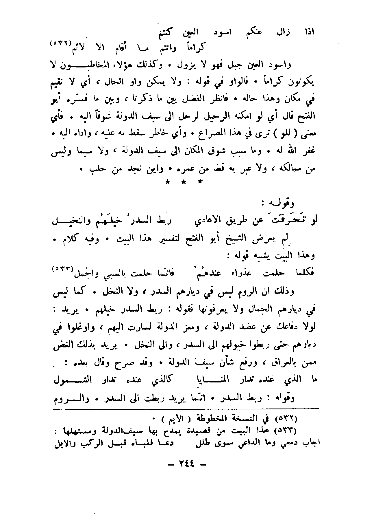 وأسود العين جبل فهو لا يزول. وكذلك هؤلاء المخاطبون لا يكونون كرماء. فالواو في قوله: ولا يمكن واو الحال، أي لا نقيم في مكان وهذا حاله. فانظر الفضل بين ما ذكرنا، وبين ما فسره أبو الفتح قال أي لو أمكنه الرحيل لرحل إلى سيف الدولة شوقاً إليه. فأي معنى (للو) ترى في هذا المصراع. وأي خاطر سقط به عليه، وأداة إليه. غفر الله له. وما سبب شوق المكان إلى سيف الدولة، ولا سيما وليس من ممالكه، ولا عبر به قط من عمره. وأين نجد من حلب.