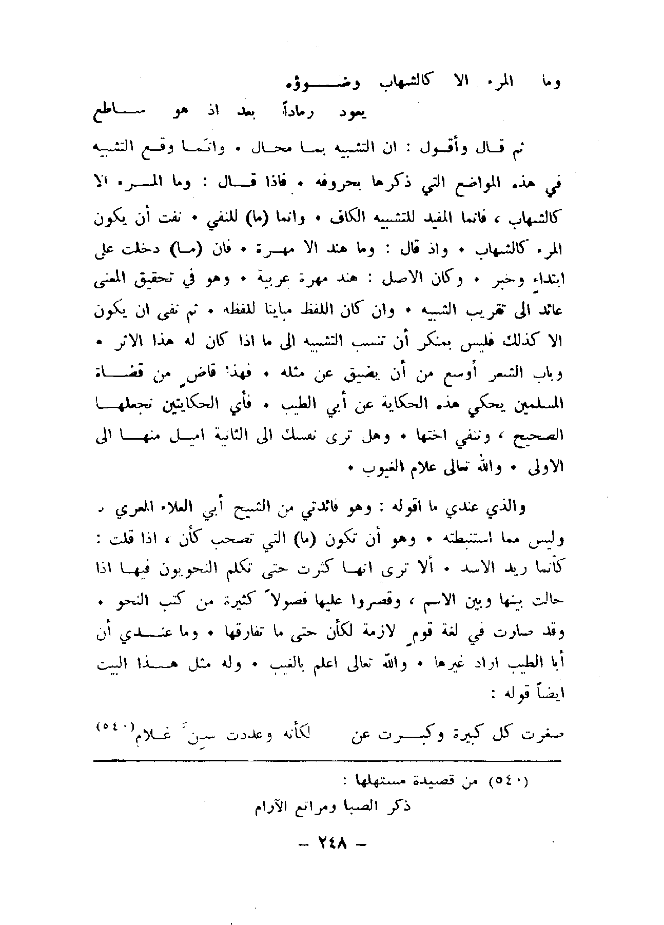ثم قال وأقول: إن التشبيه بما محال. وإنما وقع التشبيه في هذه المواضع التي ذكرها بحروفه. فإذا قال: وما المرء إلا كالشهاب، فإنما الفيد للتشبيه الكاف. وإنما (ما) النفي. نفت ان يكون المرء كالشهاب. وإذ قال: وما هند إلا مهرة. فان (ما) دخلت على ابتداء وخبر. وكان الأصل: هند مهرة عربية. وهو في تحقيق المعنى عائد إلى تقريب التشبيه. وأم كان اللفظ مباينا للفظه. ثم نفى أن يكون إلا كذلك فليس بمنكر أن تنسب التشبيه إلى ما إذا كان له هذا الأثر. وباب الشعر أوسع من أن يضيق عن مثله. فهذا قاض من قضاة المسلمين يحكي هذه الحكاية عن أبي الطيب. فأي الحكايتين نجعلها الصحيح، وننفي أختها. وهل ترى نفسك إلى الثانية أميل منها إلى الأولى. والله تعالى علام الغيوب.